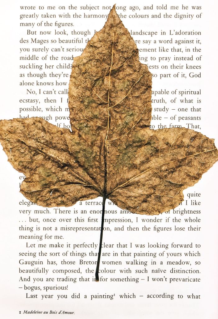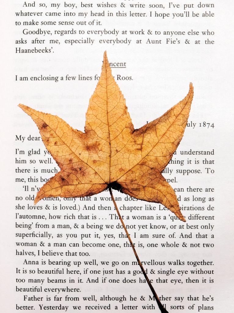 My wife and I moved in 2020 and, for no particular reason, I gathered a few leaves when we walked around our new neighborhood. I pressed the leaves in the first book I grabbed off my shelf, which happened to be the Penguin Classics edition of The Letters of Vincent van Gogh. I love browsing through Van Gogh’s letters, mostly written to his brother Theo. The letters can be read chronologically, as they’re presented in the book. Or, you can open to just about any page and find Van Gogh at an interesting point in his fascinating journey. Despite his tragic end, Van Gogh had frequent moments of upbeat wonder at the people around him, the natural world, and how they might be depicted in art. While continuing to wait out the Covid-19 pandemic, I photographed the leaves against the respective pages where they were pressed. It’s a simple project, but something about the texture and colors of the leaves against the text had me trying to see a small piece of the world as Van Gogh might have seen it.