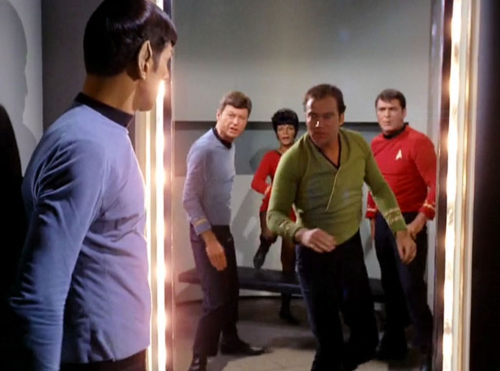 The MU characters are also portrayed in a way that not only creates a believable alternate reality but also gives us more appreciation for their normal universe equivalents. Mirror-Sulu has a long scar on his face. Spock has a goatee. The men wear sashes on their uniforms and the women simply wear much less uniform. Mirror-Spock is still the science officer, and prefers scientific duties over life-and-death imperial politics, but also demonstrates a more active leadership role, similar to Riker’s status in TNG. He also has a Vulcan bodyguard, the first time we see another Vulcan serving on the Enterprise. Mirror-Spock still plays 3D chess, but mirror-Kirk has no books in his cabin, which may explain why he only thinks in terms of wealth and power when he tries to gain Spock’s confidence in the normal universe. Mirror-McCoy, apparently, is still an old country doctor pacifist, as mirror-Spock calls him “sentimental” and “soft.” (Mirror-Spock is not surprised when McCoy risks being trapped in the MU to save him.) Once they understand their situation, Kirk immediately puts his landing party to work as a team, something clearly foreign to the always-shifting alliances of the MU. It’s significant that the normal-universe characters master the MU fairly quickly, while their MU equivalents are just as quickly tossed in the brig, posing little threat to anyone.