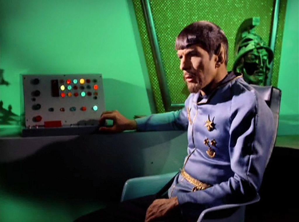 In real life, evidence of alternative realities may or may not exist. As one of the Tor TOS rewatchers pointed out, physicist Hugh Everett III proposed a many-worlds interpretation of quantum physics in 1957, in which alternative events may spin off into different universes than our own. Contemporary physicists debate the existence of parallel universes in terms far over my head, but the alternate universe in “Mirror, Mirror” is depicted convincingly, with subtle and obvious differences that lend credibility to the premise. The captain’s chair has a taller back, the Enterprise design is slightly different, and the Empire’s logo – a sword piercing the earth – is everywhere. Compared to the normal universe, where dereliction of duty is tolerated (remember Stiles in “Balance of Terror”?), in the mirror universe even relatively minor errors are penalized with an agonizer, a device that inflicts brutal pain on the recipient. (For crying out loud, don’t tell Jeff Bezos about this.) And while betrayal is another day at the office in the normal universe (remember McGivers in “Space Seed”?), gross insubordination in the MU results in a trip to the agony booth, a phone booth-sized compartment that’s true to its name; mirror-Chekov screams in, well, agony, when he’s sent there after a failed attempt on Kirk’s life.