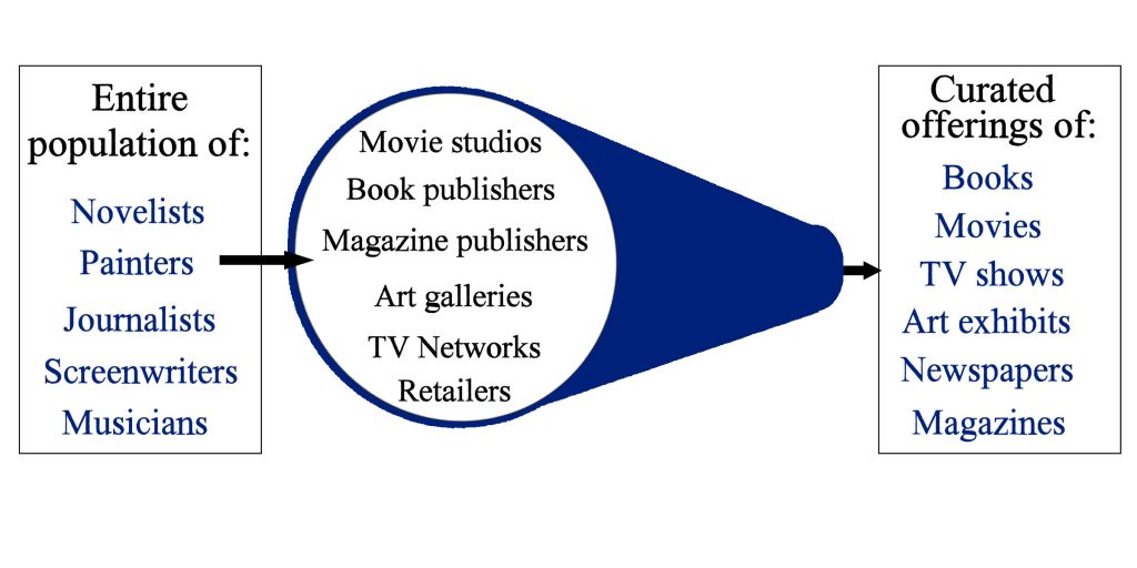 Today anyone can create and distribute content via Youtube, social media, print-on-demand or digital book publishing, podcasting platforms, music distributors like CDBaby and TuneCore, and a myriad of other Web-based or on-demand venues. Historically, it was hard to find an audience because you had to be allowed through the funnel by a publisher, producer, agent, or some other individual or group. That model of front-end management still exists today, but content creators can pursue an alternate path, and associated challenges, of finding their own audience by going direct to consumers. In essence, the funnel has widened to allow a lot more voices through. This model is still biased in favor of large corporations, which have the resources to promote their content, game the relevant algorithms, and overwhelm us with quantity. But what was once a manageable river of content has become a raging waterfall.