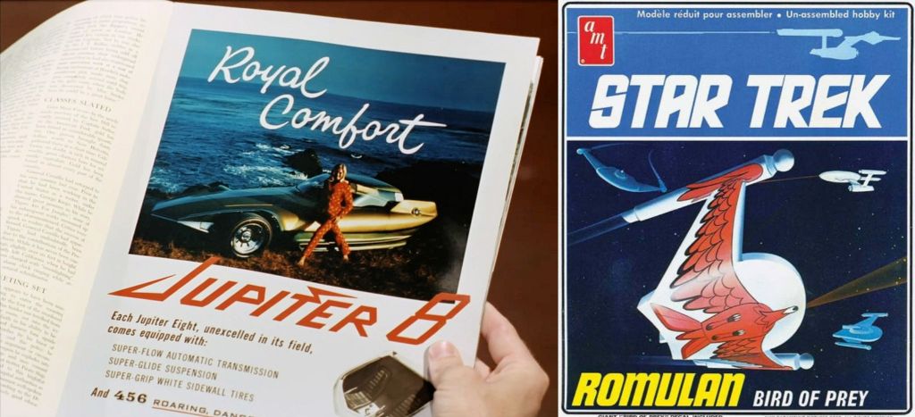 The episode comes across as a lazy attempt at an alternate history story while using readily available sets and wardrobe. According to Memory Alpha, “A number of costumes and props were recycled from Paramount’s storage vaults, including the Roman guards’ outfits. Many of these items were originally made for Cecil B. Demille’s epics such as The Sign of the Cross, Cleopatra, and The Crusades.” “Bread and Circuses” was actually the 14th season two episode produced but the 25th to air; if the episodes had aired in production order, maybe the “duplicate earth” premise wouldn’t have seemed so worn out by this time. Regardless, as viewers, we shouldn’t have to perform episode math; societies identical to earth (with heavy influence from the 20th century) were an overused conceit in Star Trek either way. The “Bread and Circuses” planet has “an excellent road system” (because so did the Romans!) complete with heavy smog in the atmosphere. No need for a universal translator, because Spock somehow recognizes that the locals are speaking “colloquial 20th century English;” in this case, English is required to justify the goofy word-game inflicted on us in the final scene. We even see a magazine with ads for Jupiter 8 cars, Mars toothpaste, and Neptune bath salts. Kirk justifies this earth-copy with the entirely made-up Hodgkin’s Law of Parallel Planetary Development. They should have called it the Law of Exhausted TV Anthology Writers Hamstrung by Network Deadlines.