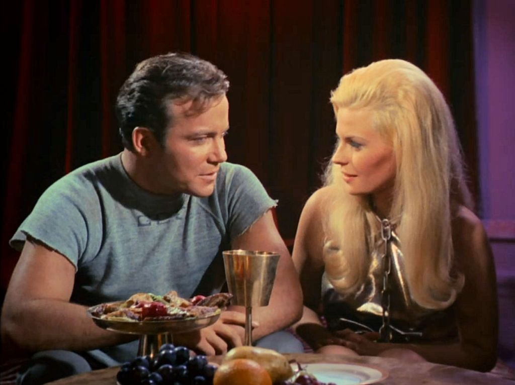 Claudius even praises Kirk over Merik, despite his plans to execute Kirk on live television – eliminating a threat and boosting ratings in one move. This helps create the conflict that inspires Merik to help Kirk and company escape in the end. Merik and Kirk are old friends, because Kirk knows everyone somehow, but the difference between the two is spelled out for us early on: Merrick captained a mere survey vessel because he was dropped from Starfleet Academy after failing a psychosimulator test. We don’t know what a psychosimulator is, but the implication is clear that Kirk completed the work that Merik could not. Claudius even sends his slave girl Drusilla (Lois Jewell) to spend the night with Kirk. What a relief that Drusilla smiles when she tells Kirk, “For this evening I was told I am your slave. Command me.” To make sure we have no doubts about the time Kirk and Drusilla spend together, Claudius explains, “Because you are a man I gave you some last hours as a man.” Kirk seems okay with that, as he shows no hesitation or regret at sexually exploiting an enslaved woman. Later, when Kirk escapes and frees Spock and McCoy from their prison cell, the captain explains his delay: “They threw me a few curves.” For all his obsession with liberating previous societies, Kirk shows no interest in helping the slaves of 892-IV.