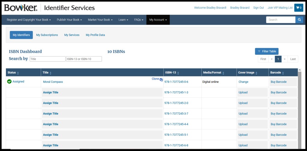 My preference was to purchase my own ISBNs from Bowker: that way, I’m identified as the publisher and I can use the identifiers on any platform. You will first need to create a user account, a simple and free process. At the time I’m writing this, a single ISBN is $125, while a set of 10 is $295. ISBNs don’t expire, so once purchased, an ISBN can used at any time in the future. If you plan to publish a work in both ebook and print editions, you need two ISBNs. Since I was on the verge of publishing two novels, with a third in the works, I would need six ISBNs for digital and print editions, so the package of 10 ISBNs was just right for me. The ISBN purchase is easy to complete online, and you will receive your ISBNs via e-mail. If you lose that e-mail, you can always confirm your ISBNs via your Bowker account.