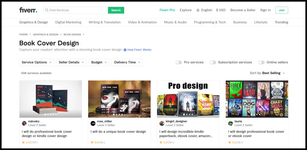 There are many options out there for designing or purchasing book covers, but I’ll discuss my own experience with artists on Fiverr. Fiverr is a gig site for visual artists offering a wide range of services in addition to book cover design. The artists on Fiverr vary widely in both experience level and prices.