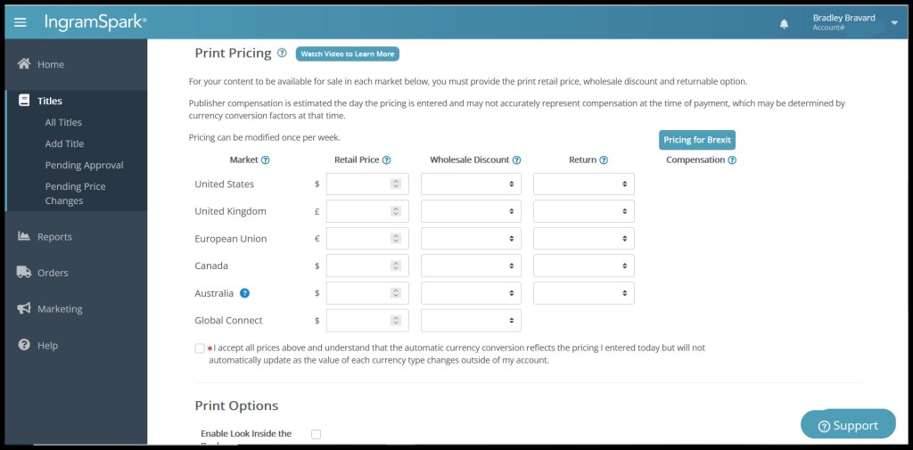 - Unlike Amazon KDP (to be discussed in a future blog post), IS charges a setup fee, which for print books is currently $49. There is also the aforementioned change fee.