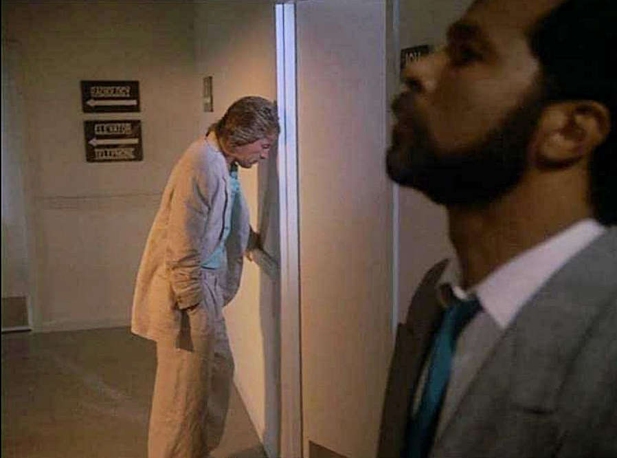 The marriage episodes are the most significant in leading up to Crockett’s immersion in his Sonny Burnett cover identity at the end of Season 4, but they are also some of the most problematic of the series. These episodes, collectively, feel like an extended dream sequence. Look how easy it is for both us and the characters to forget Crockett is even married during the interim episodes. The entire storyline feels like an alternate life dreamed by Crockett or Burnett. Easton, as Caitlin, even sings “I’m starting to lose touch with my reality” in her final appearance. “A Bullet for Crockett” (S4E20), while largely a clips episode, feels like a “real-life” entry to the Sonny Burnett storyline that begins with “Mirror Image” (S4E22), while Caitlin’s death in “Deliver Us From Evil” (S4E21) concludes the fever dream of the better life that got away. It’s possible that Caitlin’s death at the hands of Frank Hackman (Guy Boyd), the killer who duped Crockett into helping him escape death row in “Forgive Us Our Debts” (S3E11), represents a karmic rebalancing, the payback for Crockett’s assault to coerce a witness into confession in that earlier episode. And Crockett’s further suffering, a suffering that radiates outward to his partner and colleagues as well, must be further cosmic retribution for his assassination of Hackman in “Deliver Us From Evil” (S4E21). Crockett’s break from reality at the end of Season 4 does what none of the series’ previous events could do – break the partnership between the two detectives.