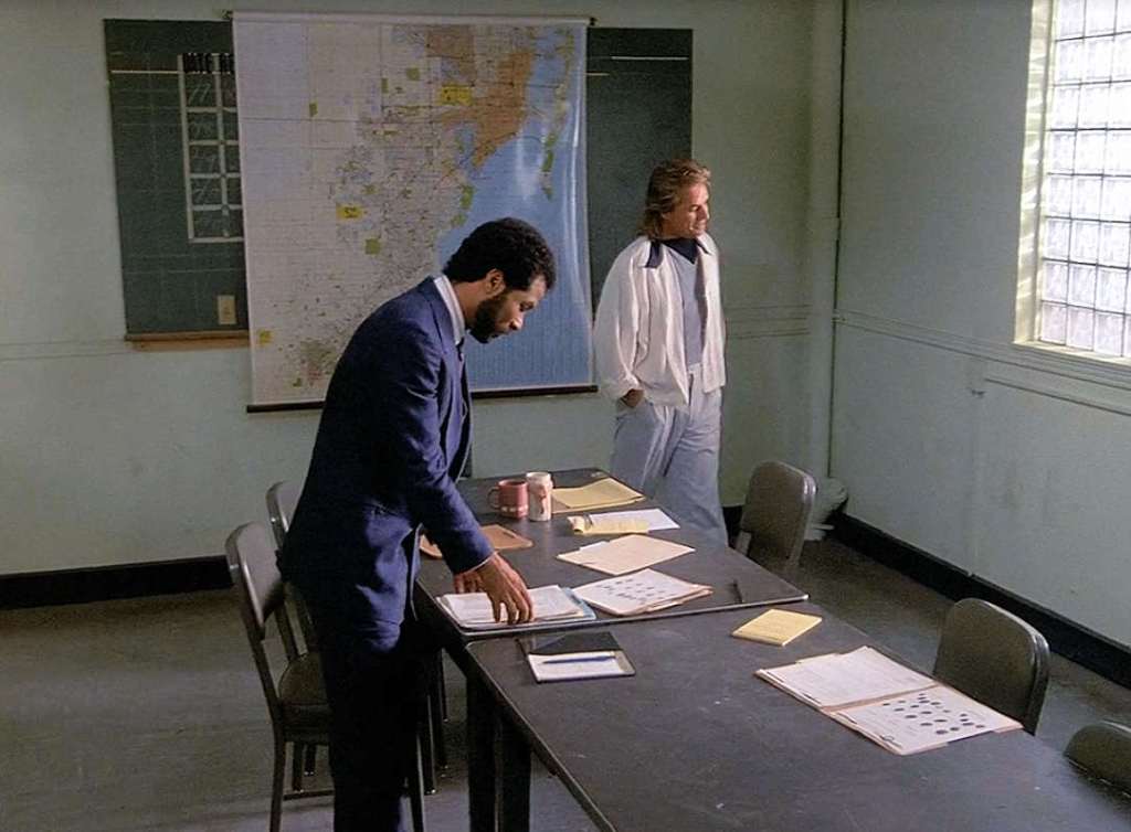 The Sisyphean nature of law enforcement is even more evident in these seasons, and it affects the entire ensemble cast. Tubbs experiences the realities of prison life in “Walk-Alone” (S3E4). Trudy sees the long-term effects of crime on its victims in “Hell Hath No Fury…” (S4E17). Gina faces the ethical dilemmas, and consequences, of undercover work in “Blood & Roses” (S4E19). The struggle is so relentless, it crosses generations, as in “El Viejo” (S3E7), with a weary Crockett asking, “We never get even, do we?” Tubbs’ response: “You can’t, man.” Again in “Blood & Roses” (S4E19), Tubbs observes during a stakeout that all the houses look the same; for all their risk and sacrifice, nothing seems to change. And, just as with Rodriguez’ death in Season 1, the death of Larry Zito in the two-part “Down for the Count” (S3, E12 and E13) is a poignant reminder to take nothing for granted because no one is truly safe. The episode also shows us the Zito/Switek partnership in a way most viewers hadn’t considered, as important a bond as that between Crockett and Tubbs.