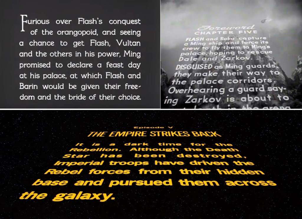 Flash Gordon (1936) was followed by Flash Gordon’s Trip to Mars in 1938 and Flash Gordon Conquers the Universe in 1940. Serial films were also not new at the time, dating back to the movie industry’s silent era. The Hazards of Helen was one of the longest: 119 episodes released from November 1914 through February 1917. Poor Helen, played by more than one actress because of the project’s length, had quite a troublesome life, burdened by such threats as runaway trains, runaway cars, and runaway horses. Flash Gordon took place over 13 weekly episodes, and each episode had a run-time of approximately 18-20 minutes. The entire production ran more than four hours – top that, Matt Reeves! Each episode began with a text-based summary of the previous episode, an idea that, by the time of Flash Gordon Conquers the Universe in 1940, evolved into the title crawl that Star Wars fans will recognize. That’s only one example of many influences the Flash Gordon serials had on contemporary science-fiction.