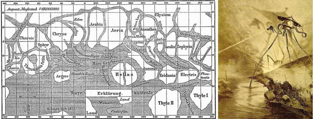 Drawing of Mars “canals” by Giovanni Schiaparelli; illustration from 1906 French edition of The War of the Worlds