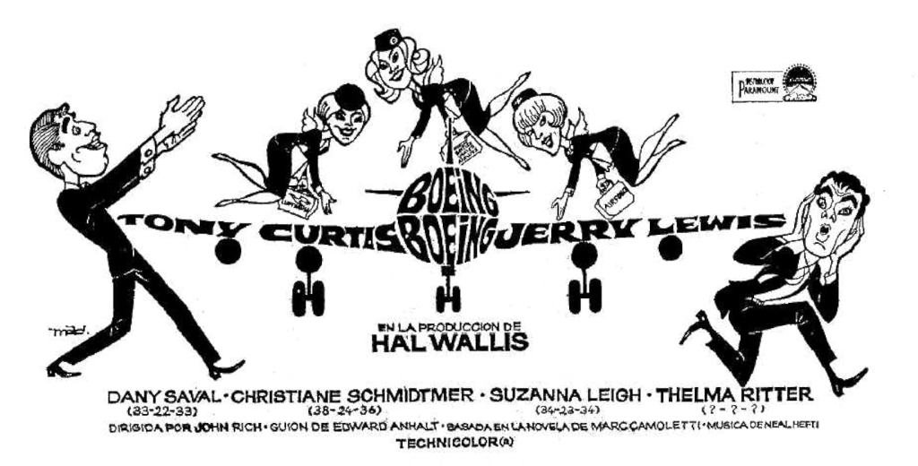 Like Lewis, Tony Curtis had performed in beloved films over the past decade, playing diverse characters in Sweet Smell of Success (1957), The Defiant Ones (1958), Some Like It Hot (1959), and Spartacus (1960). An early career focus on dramas led to a series of romantic comedies in the 1960s – including Boeing Boeing – that seemed to lead to a downturn in Curtis’ popularity, in movies like Wild and Wonderful (1964), Goodbye Charlie (1964), and Not with My Wife, You Don’t! (1966). Curtis seemed to genuinely admire Lewis – Lewis had attended Curtis’ 1951 marriage to Janet Leigh – but a professional rivalry between the actors is reflected in the placement of their names on the poster, in the shape of an airplane propeller, to emphasize equal billing. The opening credits were similarly designed, with the two names spinning around the front of a jet engine. The production was also troubled by Lewis’ status with Paramount; despite the 1959 contract, Lewis’ box office had been declining and in 1966 Paramount was acquired by Gulf + Western. Lewis held up filming by leaving the set multiple times without warning. Boeing Boeing ended up being his last film with Paramount, the studio where he had launched his career alongside Dean Martin in 1949.