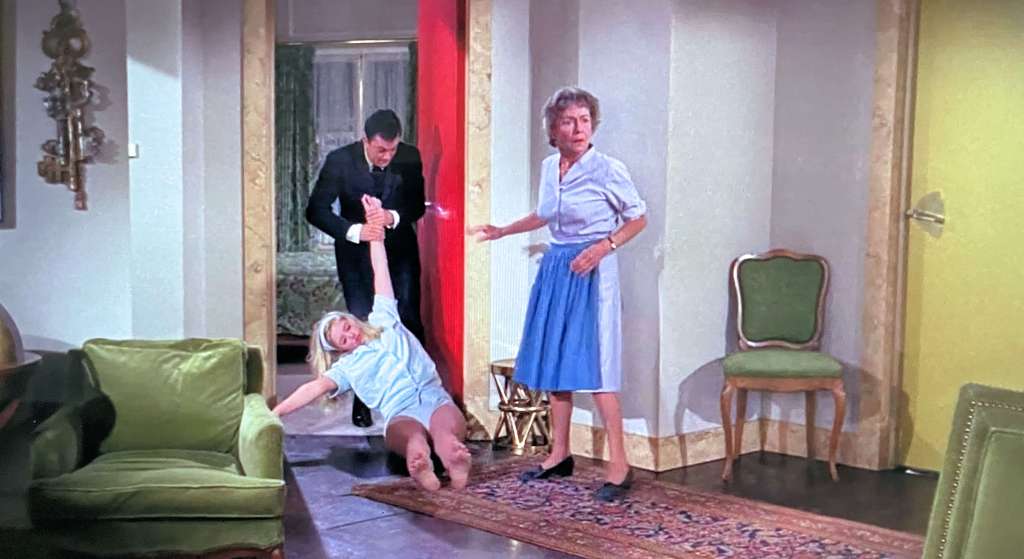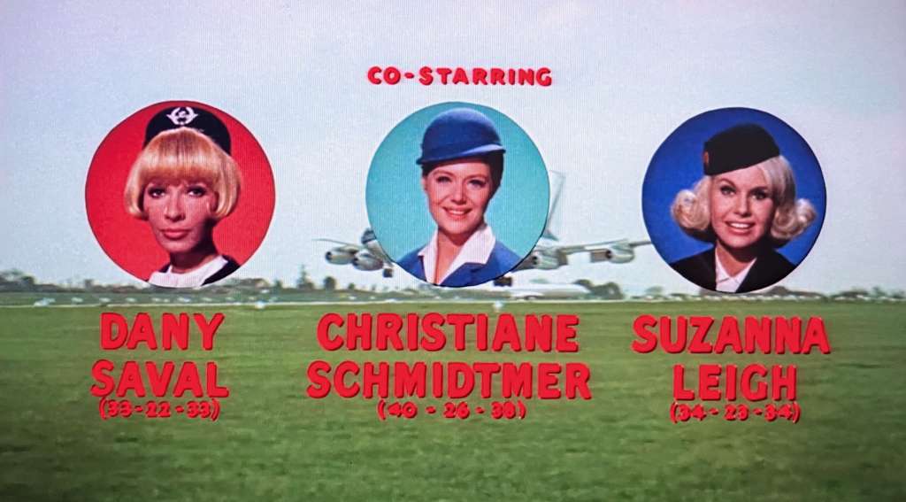 The flight attendant roles are performed by Dany Saval (Air France), Christiane Schmidtmer (Lufthansa), and Suzanna Leigh (British United). We’re introduced to the trio in the opening credits with not just their photos, but their measurements! Why, that’s just…ahem…data for Organization Man to…process and collate and…whatever. It’s small consolation that the movie doesn’t reduce the women to a set of numbers, but instead to two-dimensional personalities defined by cultural cliches: for example, for breakfast, Miss Air France expects souffle, Miss Lufthansa wants sausages and sauerkraut, and Miss British United demands kidneys. Constant shuffling of the breakfast menu is one of housekeeper Bertha’s tasks that becomes more complicated as the three women converge on Paris at the same time.