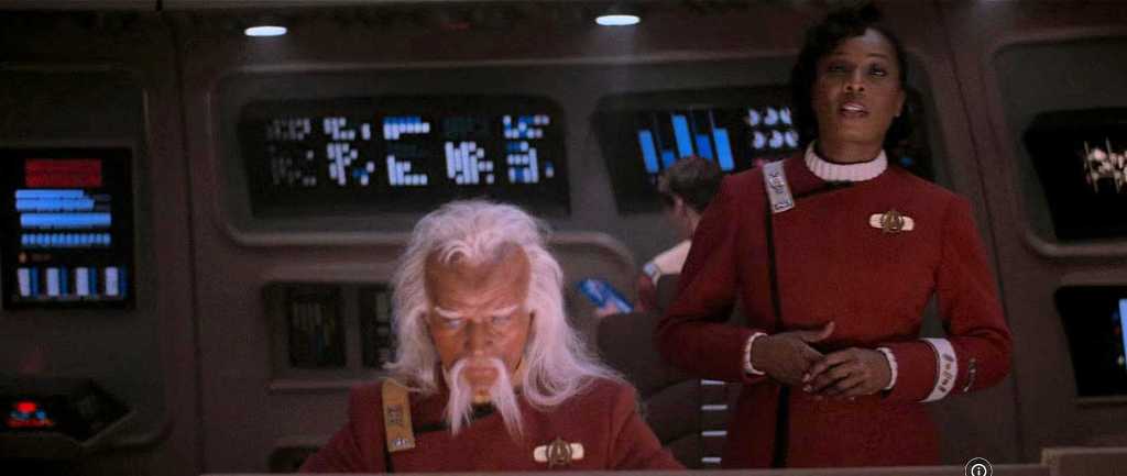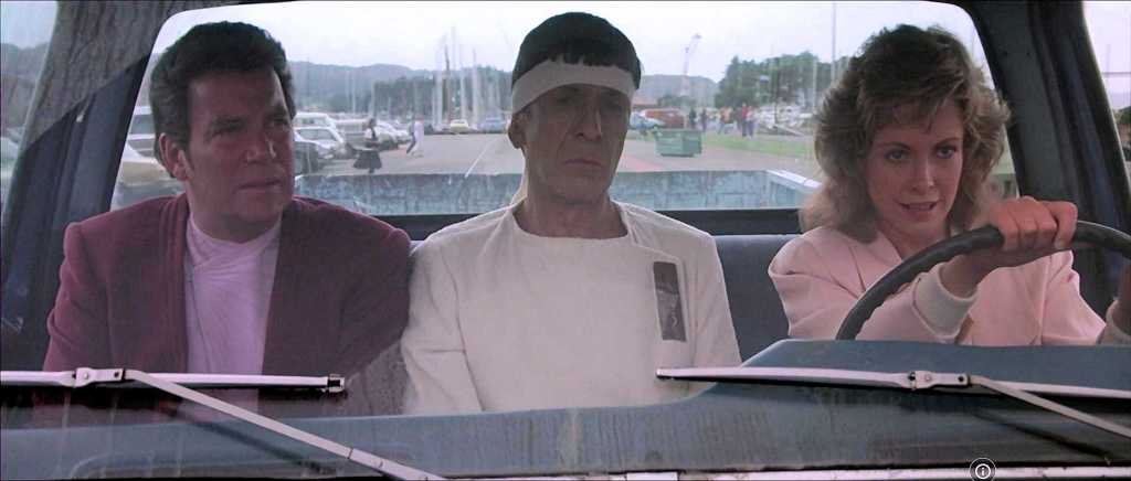 Of course, Spock’s absent-mindedness is the most notable character status, as he recovers from the tumultuous events of Star Trek III. The lighter tone of this film means that Spock’s emotional state will be easily resolved, but what a joy that the journey is launched by Spock’s mother Amanda (Jane Wyatt), who we haven’t seen since Season 2’s “Journey to Babel“. “How do you feel?” is Amanda’s question – the same question McCoy asked Kirk at the end of Star Trek II – reminding us that her human DNA is part of Spock’s nature, whether he acknowledges the fact or not. This somewhat revisits Spock’s character growth from The Motion Picture, but the poor guy was dead, so a little repetition seems reasonable. “I do not understand the question,” is Spock’s initial response to Amanda. In yet another parallel to The Motion Picture, the experience of saving the earth is what gets Spock to, if not a thorough understanding of the question’s relevance, at least the ability to provide an answer: “I feel fine.”