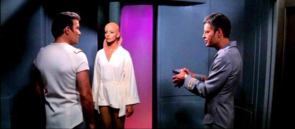 The grown-up pacing means TMP takes its time bringing our characters together. That includes meeting the two primary new-comers, Decker and Ilia. Decker’s backstory didn’t make it into the final film but was described in the novelization by Gene Roddenberry: Decker was the son of Commodore Matt Decker (William Windom) from the second season episode “The Doomsday Machine.” In that episode, Commodore Decker was traumatized by the loss of his crew to a mysterious planet destroyer; he tried to seize command of the Enterprise on a quest for vengeance as a result. Does that event influence Will Decker’s experience of losing command to the Enterprise‘s former captain? Some of Ilia’s backstory is also muddled and probably not adequately explained: she is a Deltan, whose pheromones turn humans of the opposite gender to mush. Ilia also demonstrates healing abilities when Chekov is injured on the bridge. The Decker/Ilia romantic past was an inspiration for the Riker/Troi relationship in The Next Generation.