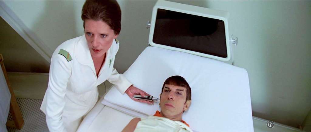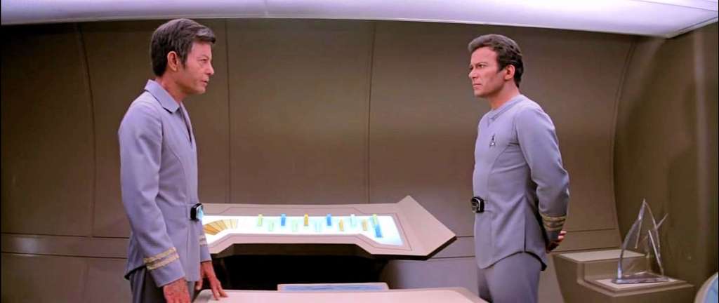 The remaining characters – Kirk, Spock, McCoy, and Decker – are individuals who have lost their way and need to figure out what they really need or want out of life. McCoy has perhaps the least clarity under this interpretation, primarily because his arc is resolved so early in the film. All we know about McCoy post-Starfleet is that he has retired and grown an impressive beard. He is plenty upset at being drafted back into service, and who can blame him? Starfleet has been presented as a noble undertaking in a future where humans live lives of their own choosing. The “reserve activation clause” used to conscript McCoy has sinister potential. How often is this clause invoked? This really deserves more attention. Still, after one pep talk from Kirk, the doctor embraces one of his most important roles from TOS: keeping Kirk in line. It’s almost as if Kirk recognizes the need to be saved from his own impulsiveness. Before we know it, McCoy intervenes in the Kirk/Decker feud to remind Kirk that he is essentially the bad guy in that dynamic. Tending to his friends is what McCoy really needed. This is possibly my favorite Leonard McCoy appearance in the feature films.