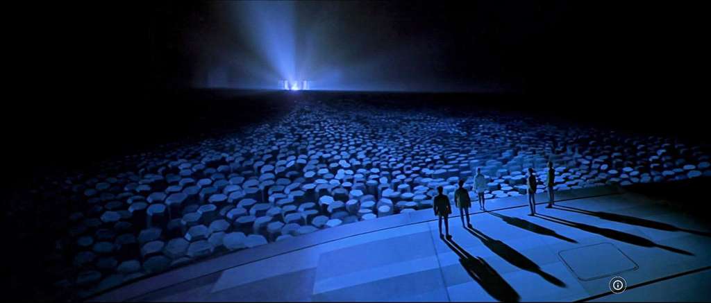 With blissfully little time catching up with what our heroes have been doing the past ten years – because these were the good old days when we didn’t need a steady IV drip of Easter eggs and origin stories – we jump into the action fairly quickly. An alien entity of overwhelming size and power is detected by the Federation when it (the entity) destroys three Klingon vessels and sets a course for Earth. By an astonishing coincidence, the newly overhauled USS Enterprise is the only starship close enough to intervene. Why the Federation doesn’t have stronger fleet capacity around its headquarters planet is never explained. Kirk, now an admiral and head of Starfleet Operations, quickly pulls rank and takes command of the untested Enterprise from her intended captain, Will Decker (Stephen Collins). Uhura, Sulu, Chekov, Scott, Chapel, and Rand (welcome back!) are already on board, along with new navigator Ilia (Persis Khambatta). Kirk drafts McCoy back in to service and pretty soon Spock shows up, so the old gang can unite to confront the entity, which calls itself V’Ger. V’Ger turns out to be the result of a merger between the earth probe Voyager 6 and an alien race of living machines. On a quest to learn all there is to know and join with its creator – destroying all “infesting” biological units in its way – V’Ger merges with Decker and an Ilia look-alike, transforming into an invisible version of the star child from 2001: A Space Odyssey.