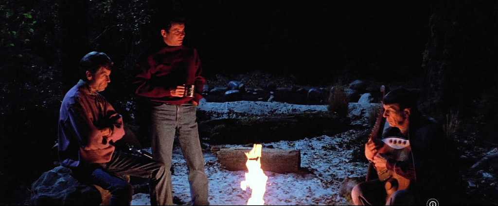 Does Kirk’s climb correlate to Sybok’s quest? (And why does Spock assume that Kirk is trying to set a record for free-climbing El Capitan?) Kirk climbs a mountain, Kirk rides horses, Kirk wears a “Go climb a rock” t-shirt: too much of STV feels self-aggrandizing, William Shatner’s attempt to promote himself as a hardy outdoorsman. Combined with Kirk’s implied moral superiority – only he and Spock resist Sybok’s charms – indicates the director’s over-sized vision of his character in relation to his numerous co-stars. Only Kirk’s well-written and compelling “I need my pain” speech saves the day. The film needs more such moments. What if we just call this mess of a film an extended dream sequence and move on?