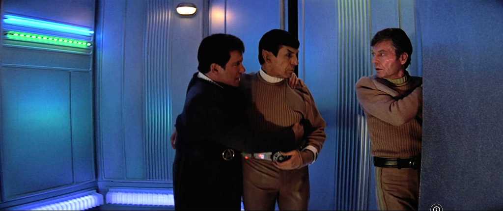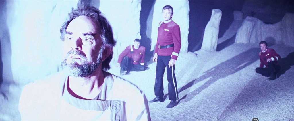 For someone who claims to seek God and paradise, Sybok, like all cult leaders, lets nothing interfere with his own self-serving view of the world. His primary recruiting tactic is an abuse of the Vulcan mind-meld, which he describes as a means of sharing pain, relieving his followers of emotional trauma previously borne in isolation. Another of STV’s flaws, perhaps the most egregious, is the ease with which Sybok recruits members of the Enterprise crew. Even McCoy succumbs, and while the scene depicting the death of McCoy’s father is very touching, this weak-willed portrayal of the doctor and the other shipmates is not believable. Really, I’m not happy with McCoy’s role throughout the film. For example, the doctor’s early anger at Kirk for free-climbing El Capitan is justified, but his actual reaction is over the top, even for emotive McCoy.