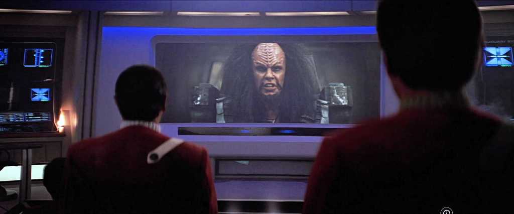 The Klingons, perhaps, are portrayed more plausibly than our original characters. Captain Klaa (Todd Bryant) might come across as a bit of a parody, but he is equally reminiscent of a young and more impetuous version of Kruge from Star Trek III. It makes perfect sense that a young Klingon captain looking to prove himself would thrill at the hunt for one of the Genesis architects. Remember, the Klingon ambassador to the Federation told us in Star Trek IV, “There shall be no peace as long as Kirk lives.” Klaa’s decision, late in the film, to pursue Kirk in the shuttle rather than the Enterprise raises an interesting question: which has more symbolic value to a fundamentalist warrior culture, the ship or the individual who commands it? Clearly, Klaa chooses the individual, distinguishing him from the God-entity and the other systems-oriented villains who would choose the ship. He even offers to let the Enterprise and her crew go free in exchange for their captain. Klaa’s final decision, however, to yield to the old and forgotten General Korrd (Charles Cooper) with the claim that Klaa’s actions are not authorized by the Klingon Empire, seems out of character. Not formally authorized, perhaps, but it’s hard to believe the Empire would complain about the prize of James T. Kirk.