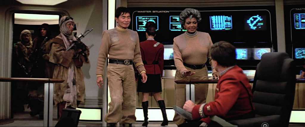 In general, the characters seem written in an attempt at easy laughs rather than sensible character development. Sulu the navigator gets lost in Yosemite, LOL! Scott the engineer knocks himself out on a bulkhead in his own ship, ROTFLMAO! And the implied Scott/Uhura romance is entirely out of left field. Such scenes are flimsy and not worthy of both the actors and the characters they have developed for more than twenty years. One scene I’m still on the fence about, though, is Uhura’s fan dance to distract the horse wranglers. On the one hand, I’m not happy at seeing Uhura sexualized in a manner more fitting to 1960s America than the 23rd century galactic frontier. On the other hand, Nichelle Nichols was in her late 50s at the time, and it was refreshing to see some acknowledgement that women can be beautiful at any age.