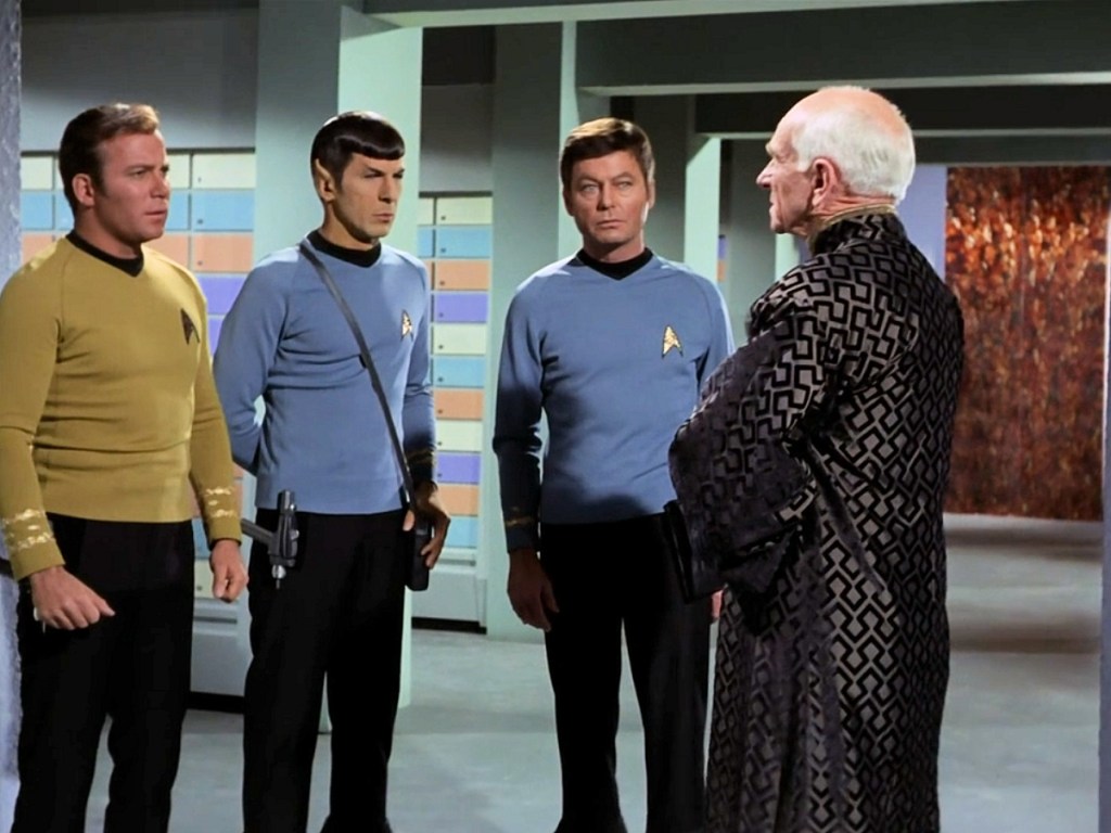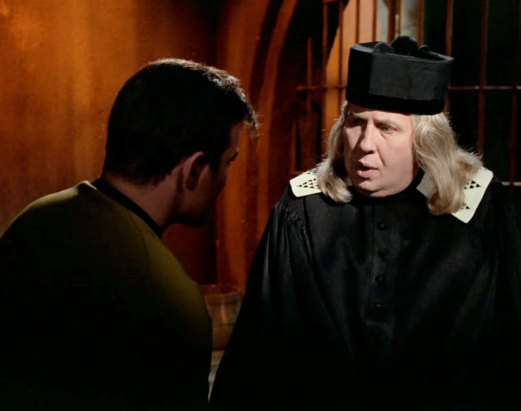 Despite being thousands of years apart, Kirk is somehow able to communicate with Spock and McCoy through the library portal. Thankfully, Kirk ends up in what looks like a poor imitation of Shakespearean England, where he can make use of his conveniently superior fencing skills to save a wench in distress. Because Kirk speaks to the invisible Spock and McCoy, he is quickly accused of being a witch, because of course an irrational fear of witches and witchcraft exists here just like it once did on earth. Kirk is ultimately saved by the Prosecutor (Kermit Murdock), who also arrived here via the Atavachron and understands the disorienting nature of the experience. Initially believing Kirk to be stuck forever in fake-England, the Prosecutor promises to use his influence to clear the witchcraft charges. In what other ways might the Prosecutor try to influence the past, which, as we’ve seen in other time travel episodes, only takes a nudge to dramatically alter the future? We never learn Sarpeidon’s pre-nova population number, but it’s hard to imagine they all went to various time periods and resisted using their advanced knowledge to serve their own self-interests. It’s only a matter of time until the Atavachron never exists because Edith Keeler wasn’t killed in a car crash.