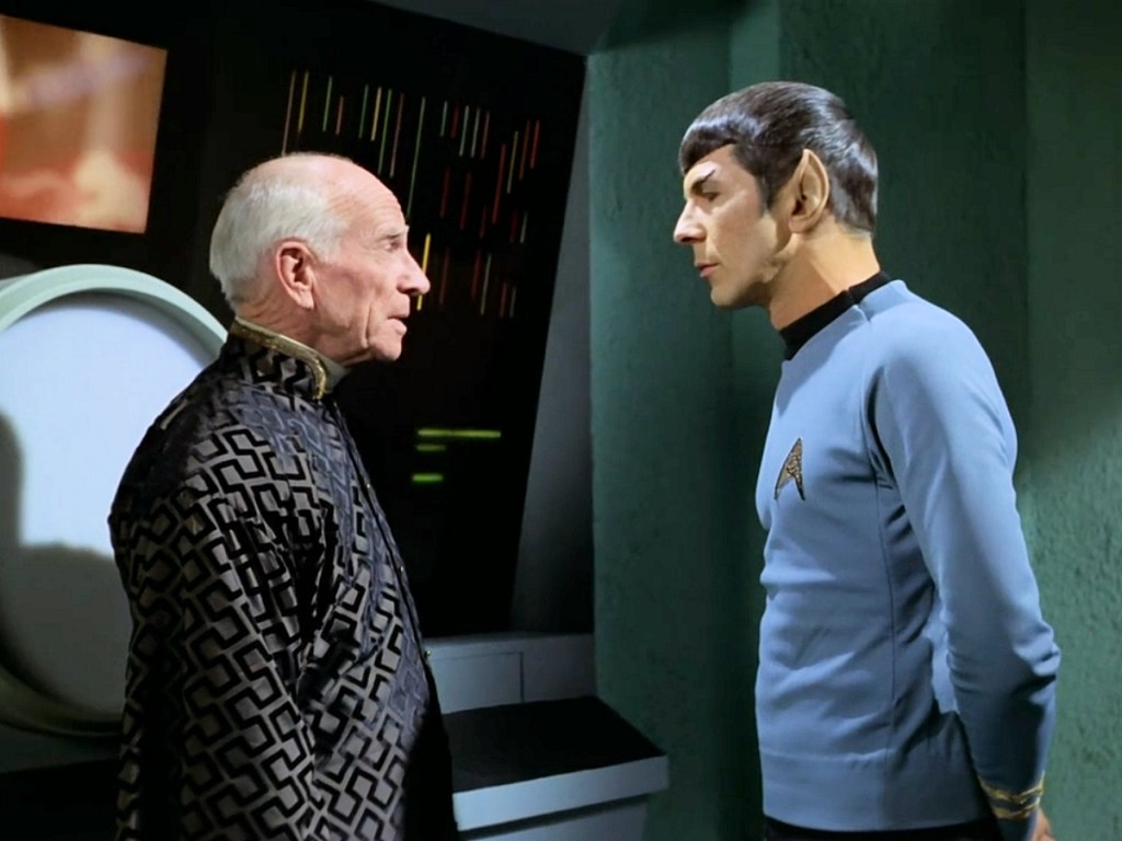 The Zarabeth storyline explores loneliness in its various forms, giving us more insight into both Spock and the human (humanoid) condition. Zarabeth exists in a snow-covered world with no hope of companionship. When Spock and McCoy appear as if by magic, she hopes, for her own sake, that they are as trapped as she is. “Zarabeth is a woman condemned to a terrible life of loneliness,” McCoy says. “She would do anything to anybody to change that.” Zarabeth’s literal loneliness complements Spock’s life of loneliness among humans. “Do you know what it’s like to be alone? Really alone?” Zarabeth asks. “Yes,” Spock answers. “I know what it is like.” Mr. Atoz must have also known loneliness in his solitary work, sending his fellow citizens on their way to temporal refuge. He escapes to safety in the final seconds, though we never see which time period he chose for himself. Given more time to develop the loneliness theme, the episode could have taken us full circle back to the Prosecutor, representative of all the Sarpeidians, cultural strangers in a time outside their own.