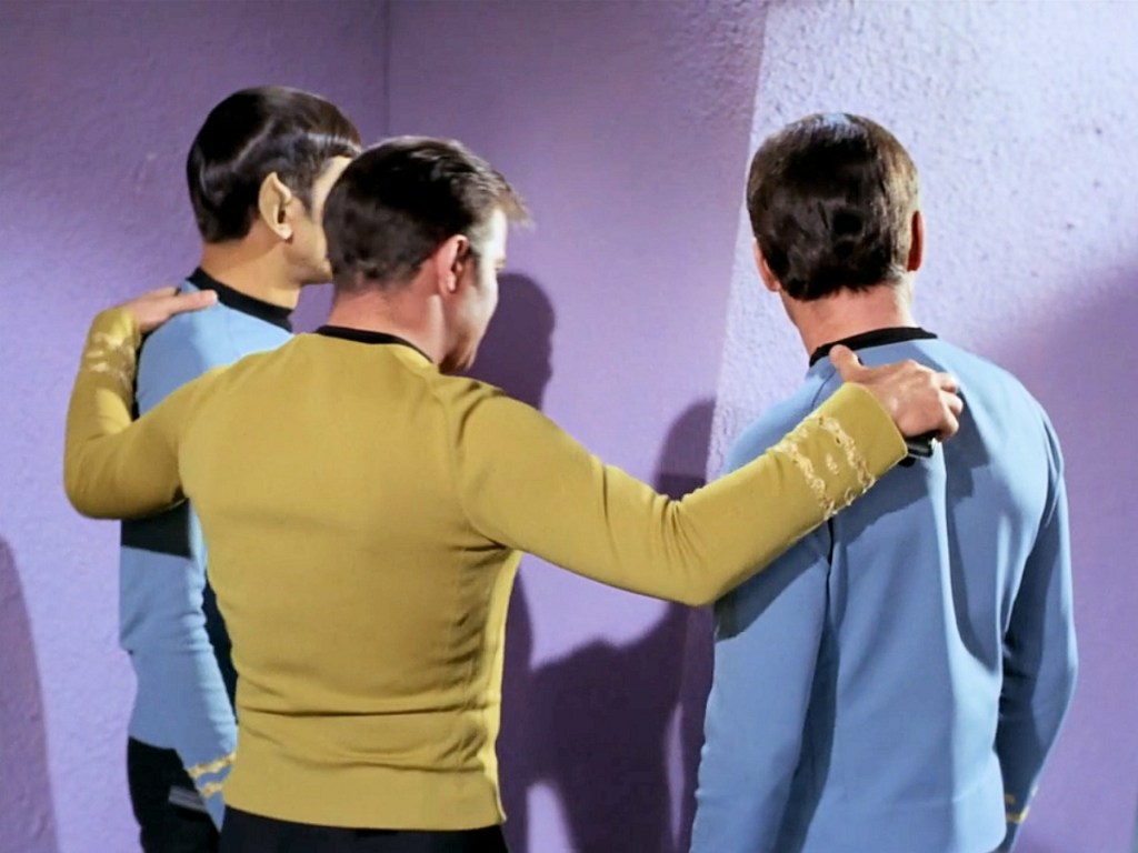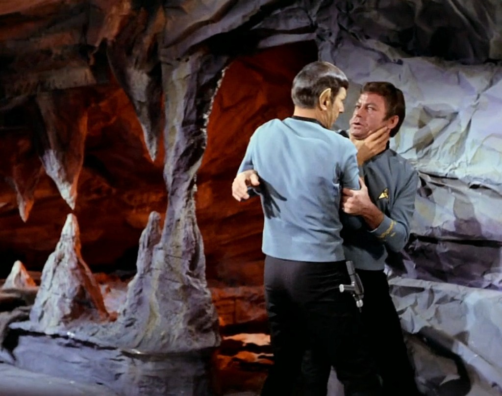 McCoy eventually resorts to the same tactic Kirk used in “This Side of Paradise,” provoking an intense emotional reaction from Spock in order to snap the first officer back to his senses. It begins with McCoy’s traditional insult, calling Spock a “pointed-eared Vulcan,” to which Spock forcefully responds, “I don’t like that. I don’t think I ever did.” This confirms what we already suspected, that McCoy’s hateful remarks were taking an unseen toll on the first officer all along. McCoy continues his effort by accusing Zarabeth of trickery and demanding of Spock, “What are you feeling? Rage, jealousy? Have you ever had those feelings before?” Finally, Spock recognizes his behavioral regression: “I’ve lost myself. I do not know who I am.” Returning to the library is not just a physical journey for Spock, but a journey back to his true self.