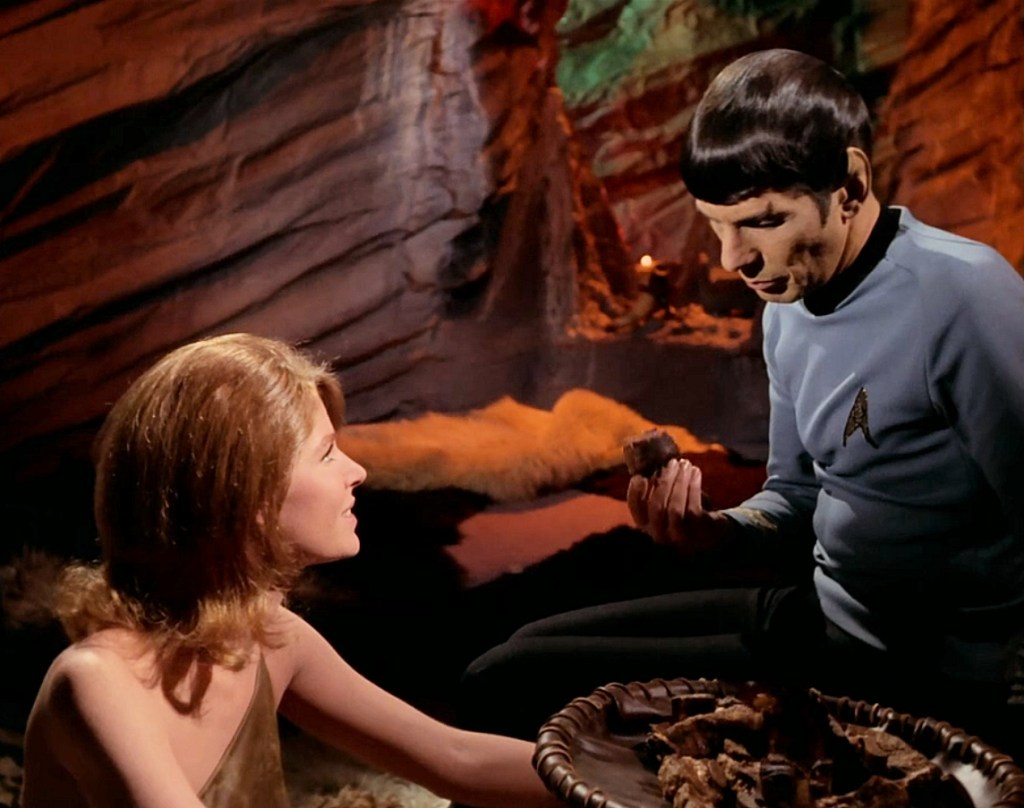 While Kirk is dueling away in fake-England, Spock and McCoy are stranded in the ancient past with Zarabeth. McCoy remains his normal crabby self, but Spock begins to revert to the primitive state of his Vulcan ancestors. (Some have speculated that only Spock changes because humans have progressed so little in five thousand years that the difference is negligible.) While McCoy refuses to give up, Spock is quick to shrug his shoulders and say “We can only hope…” the Enterprise and Kirk made it to safety. “It’s just not like you to give up trying,” McCoy observes, the physician already beginning to decipher Spock’s status. In the short term, vegetarian Spock is forced to consume meat, the only food available in the frigid climate, and while his mental state is clearly affected by the time shift, he remains clear-headed enough to plan a greenhouse.