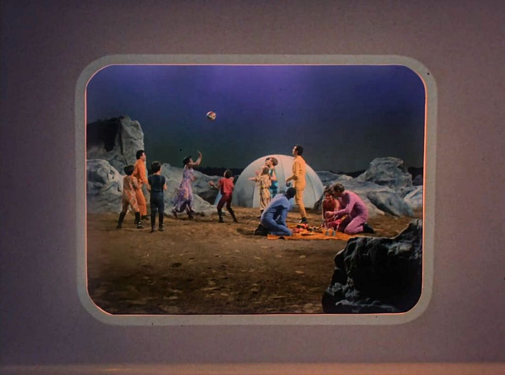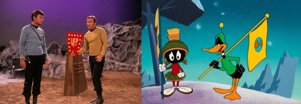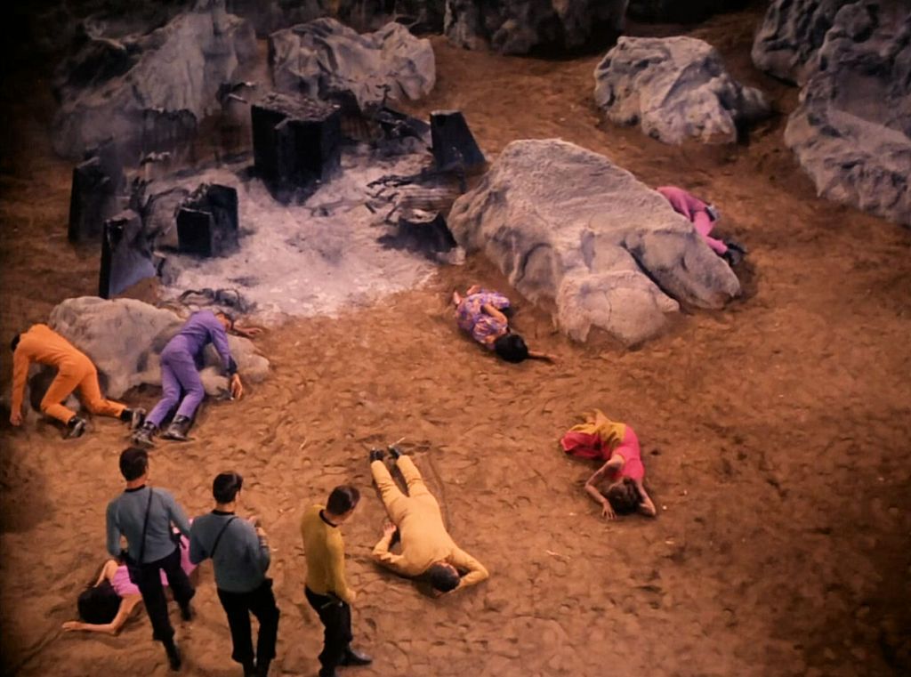 And why is Chekov the only person to remember they have phasers? Those sure would have come in handy earlier. The crew’s conduct overall is inconsistent. Chapel gets the most insightful line of the episode, when one of the kids complains about the flavor of ice cream he received: “There are unpleasant surprises as well as pleasant ones.” It’s a valuable lesson that never gets reinforced, especially since Chapel immediately offers the complainer another ice cream. McCoy wisely diagnoses the kids with lacunar amnesia, a real condition that involves loss of memory of a specific event. (Lacunar amnesia might explain why the children are more affected by the video of their parents’ deaths than the real events.) He is also the only one concerned about the childrens’ state of denial over their parents’ deaths and how they will process the inevitable grief. Unfortunately, McCoy is written out of much of the episode, so we never see what he’s up to while the children terrorize the crew. Kirk, as happened too often in TOS, forgets that he’s an explorer and focuses entirely on defeating his enemy. He soon forgets about the two security officers beamed into dead space when the transporter officer thought they were going to Triacus; he’s equally absent-minded about the security detachment left behind on Triacus who must be fairly traumatized by now. And Kirk is wise to look embarrassed by the Federation flag he plants over the scientists’ graves – it looks like something out of Duck Dodgers.