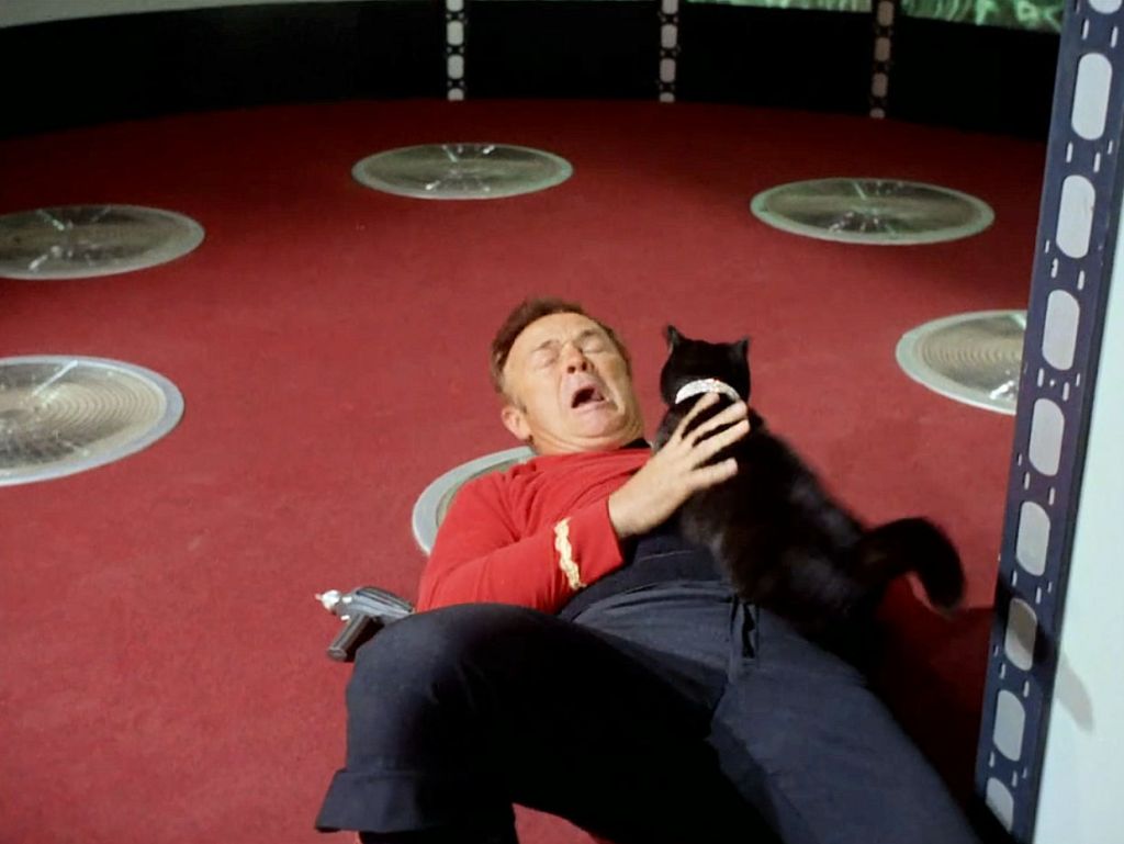 Lincoln is written as a stereotypical dumb blond and contributes nothing useful to the story. Even more inexplicable is Isis, the black cat Seven carries everywhere he goes. Isis meows or claws someone at a couple of key moments, otherwise she is generally in the way. (She does subdue an Enterprise security officer, but that’s hardly surprising.) During the brief time Seven is captive on the Enterprise, Spock develops an odd fascination with Isis, saying, “I find myself strangely drawn to it.” This is a complete turn-around from his description of cats as “ruthless” and “terrifying” in “Catspaw.” Spock’s reaction becomes a little creepy at the end of the episode, when Isis briefly assumes human form (April Tatro). Human Isis has no dialogue and quickly reverts back to feline form, leaving her, like Lincoln, almost entirely submissive to Seven throughout the episode.