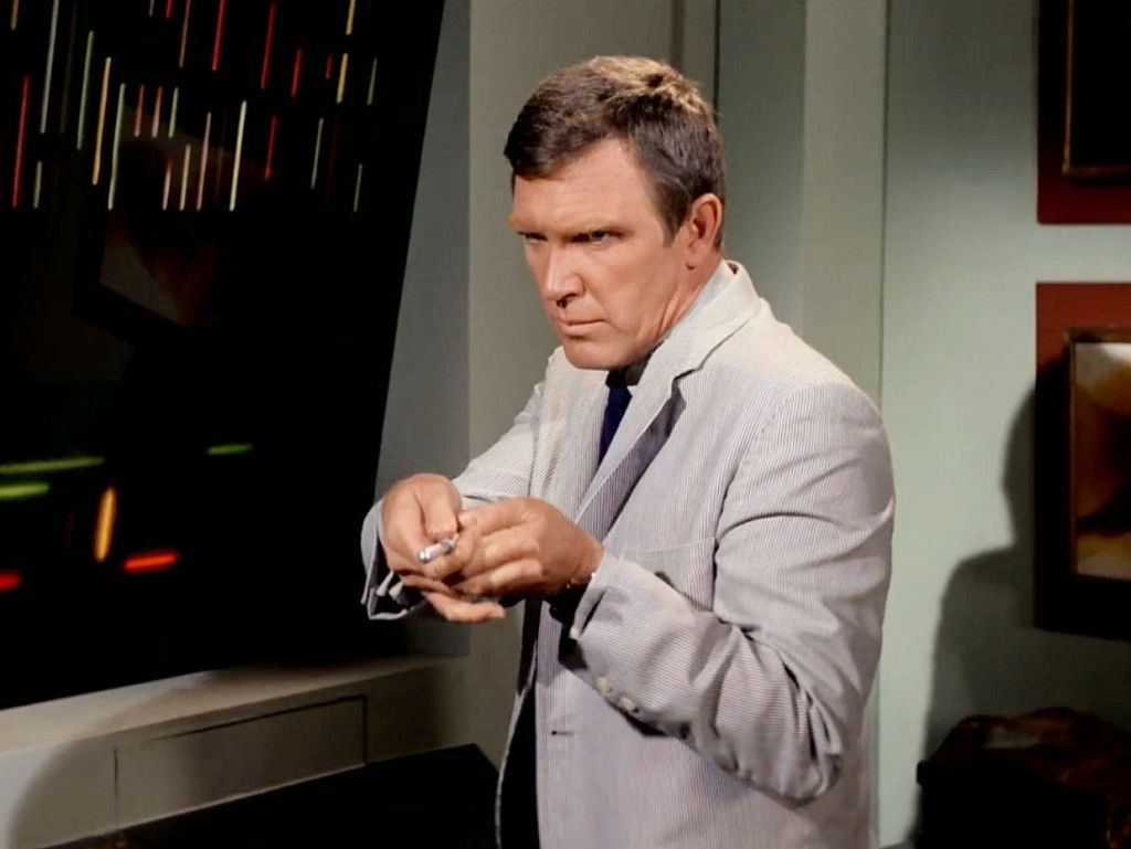 Gary Seven’s origins and abilities are appropriately vague. He carries a magic pen that performs whatever function is needed at any given moment, including leaving individuals as stupefied as McCoy’s horse tranquilizers. He is somehow impervious to the Vulcan nerve pinch. He can mimic other voices. And Seven talks about aliens from a distant world taking people from earth as far back as six thousand years ago. The Landru computer in “The Return of the Archons” was six thousand years old, and Apollo and company visited earth five thousand years ago (“Who Mourns for Adonais?”). Are they all related somehow? Could the mysterious recruiters be the Old Ones? Whoever they are, they appear to have undertaken the noble mission of rescuing societies on the verge of self-destruction. “A truly advanced planet wouldn’t use force,” Seven says. “They wouldn’t come here in strange alien forms. The best of all possible methods would be to take human beings to their world, train them for generations until they’re needed here.” In fact, Seven’s original mission is to determine the whereabouts of two similar agents already assigned to earth. In their absence, manipulating the nuclear rocket becomes Seven’s responsibility. The episode’s most poignant moment comes when Seven learns his colleagues were killed in a car crash. Seven demonstrates the mournfulness we’d like to see more often from Kirk. “That just doesn’t make sense,” Seven says, “for them to die in something as useless as an automobile accident.”