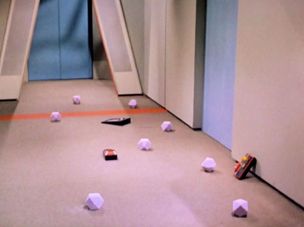 The Kelvans are an intriguing group and I wish we’d had more time to learn about them. During his brief telepathic contact with Kelinda, Spock gets images of “colors, shapes, mathematical equations fused and blurred.” He senses that the Kelvans are really very large with a hundred tentacle-like limbs. It’s a compelling description that adheres to the show’s limited budget while still indicating how different from us alien life would look. The Kelvans’ humanoid appearance is something they have adopted to better function in a humanoid ship. They are conquerors by nature and initially reject Kirk’s offer of help from the Federation, preferring to lead than co-exist: “There’s no other way for us.” The group’s leader, Rojan (Warren Stevens), describes his people as highly disciplined and willing to make great sacrifices to achieve their objectives. The Kelvans’ only real source of power comes from their nifty Bat-utility-belts, which generate a neural paralyzing field that freezes the Enterprise crew in their tracks, or worse, reduces them to small foam-like cuboctahedrons. Yeoman Thompson dies when she is downsized and crushed by Rojan as an example to the rest of the landing party. Most of the Enterprise crew is reduced to these shapes to minimize resistance to the Kelvans. “Their only hold on us is the paralysis field,” Kirk says, determining that gaining possession of those devices should be the crew’s objective.