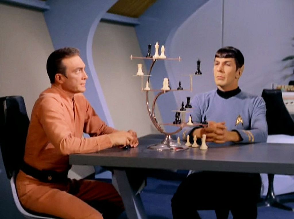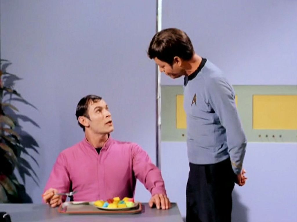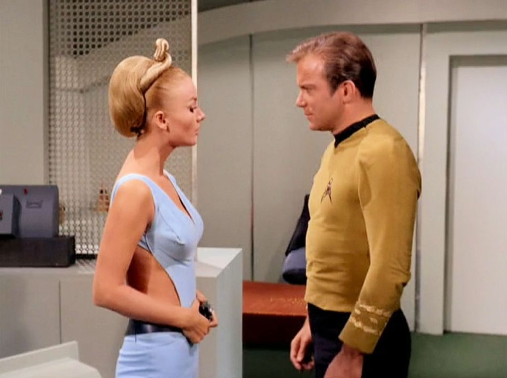 The only crew members who don’t get neutralized are, conveniently, the precise ones we need to save the day: Kirk, Spock, McCoy, and Scott. The men agree on a strategy of over-stimulating the already off-kilter Kelvans, then each proceeds to his own specialty: Kirk – sex, McCoy – drugs, Scott – alcohol, Spock – gaslighting. McCoy administers stimulants to make Hanar so irritable he questions Rojan’s leadership. Scott introduces Tomar to drunk-and-disorderly conduct, inevitable, perhaps, as “tomar” is the Spanish verb “to drink.” (Am I the only one troubled by how much liquor the engineer has stashed in his quarters?) Kirk seduces Kelinda as easily as he seduced Sylvia in “Catspaw.” And Spock gives Rojan insight into the human condition, telling him over a game of 3D chess, “Humans are very peculiar. I often find them unfathomable. But an interesting psychological study.” The first officer throws in some remarks designed to incite jealousy, the emotion that finally provokes Rojan to attack Kirk and paving the way for a solution. In a nice twist on human exceptionalism, the crew has effectively demonstrated human superiority by proving the inferiority of human vices.