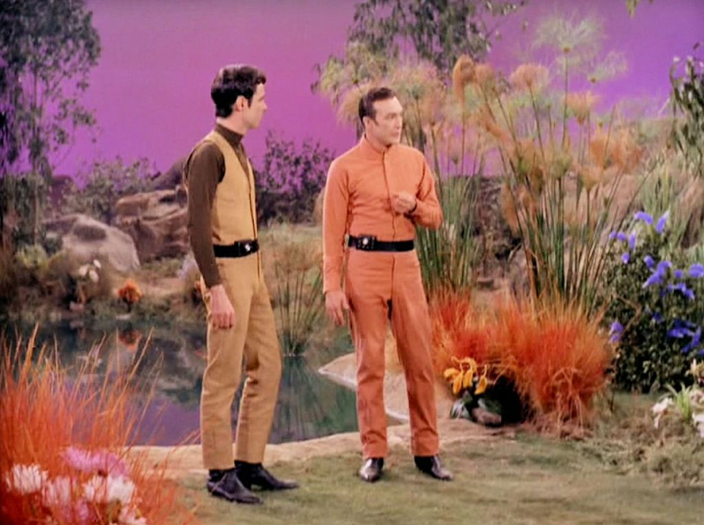 The Kelvans’ cultural isolation magnifies the effects of inhabiting human-shaped bodies that confuse them with a range of new sensations and emotions. The physiological basis for all of this is vague, but seems to relate to the new bodies distracting the Kelvans from their usual mental discipline. “These shells in which we’ve encased ourselves,” Rojan says, “they have such heightened senses: to feel, to hear, to smell. How do humans manage to exist in these fragile cases?” The Kelvans’ transformation is well-portrayed and has clearly begun by the time the Enterprise arrives. Despite Rojan’s complaint about the wide open spaces of the planet, his sidekick Hanar (Stewart Moss) is clearly intrigued: “It is an undisciplined environment. One cannot control it. Yet there are things of interest.” Tomar (Robert Fortier) is introduced to food soon after he arrives on the Enterprise, and he finds it quite delicious. Kelinda also notices the planetary scenery, too distracted by flowers to hear Rojan’s talk of discipline. This is the source of the episode’s title. When Kelinda asks Kirk the term for these plants (flowers), she describes similar growth on Kelva – something she knows of only from memory tapes – called “sahsheer.” Kirk quotes the famous passage from Shakespeare’s Romeo and Juliet: “That which we call a rose / By any other name would smell as sweet.” A flower retains its qualities regardless of what we call it. Similarly, the would-be invaders may call themselves Kelvans, but they’ve taken on human form and chosen the company of humans: they will share human traits, like it or not.
