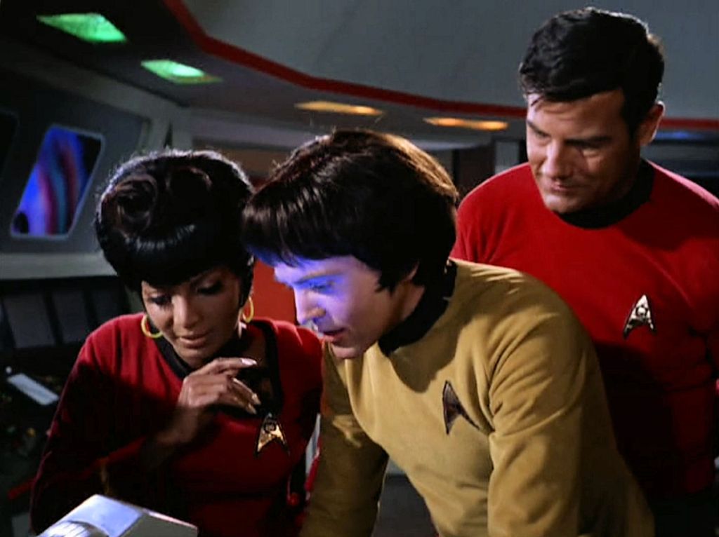While the landing party stumbles their way through this puzzle box, the crew on board the Enterprise doesn’t fare much better. Uhura and Chekov are portrayed as quick to give up and borderline panic-stricken, largely subordinating themselves to Assistant Chief Engineer DeSalle (Michael Barrier), in command of the ship in the absence of the four senior-most officers. Putting Uhura in command would have been a better choice, but perhaps NBC decided 1960s audiences weren’t ready for that. DeSalle is a bit of a jerk, barking orders and only once addressing Chekov by name, otherwise referring to him only as “Mister.”