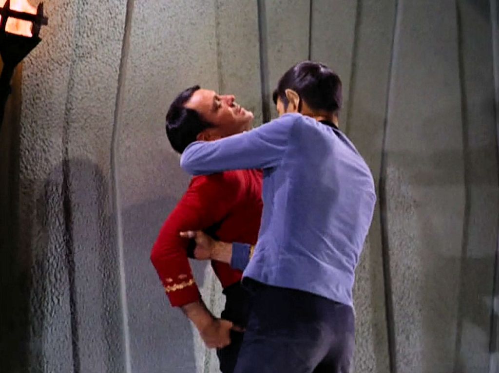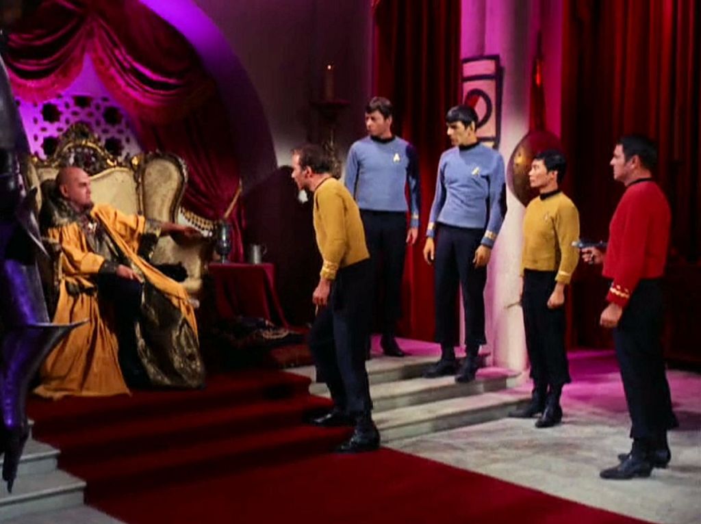 We never even learn why Sylvia and Korob are on Pyris VII, instead of some other planet. For that matter, why is the Enterprise there? They are explorers, so visiting a planet “just because” is fine, but we deserve to hear the explanation. Why did the initial landing party consist of Sulu, Scott, and Jackson? That’s an odd combination of skills for exploring a planet believed to be uninhabited. We at least learn the motive behind the various trials Kirk, Spock and McCoy are subjected to in trying to retrieve their colleagues: pursuing the search in the face of fear (such as it is) indicates loyalty, and they have integrity to resist the stash of jewels Korob offers them (also pointless, as these jewels have no value to 23rd century spacefarers). But why test the crew at all? Or, to rephrase the question: WHY??? The entire episode lacks motivations or any kind of overall theme.