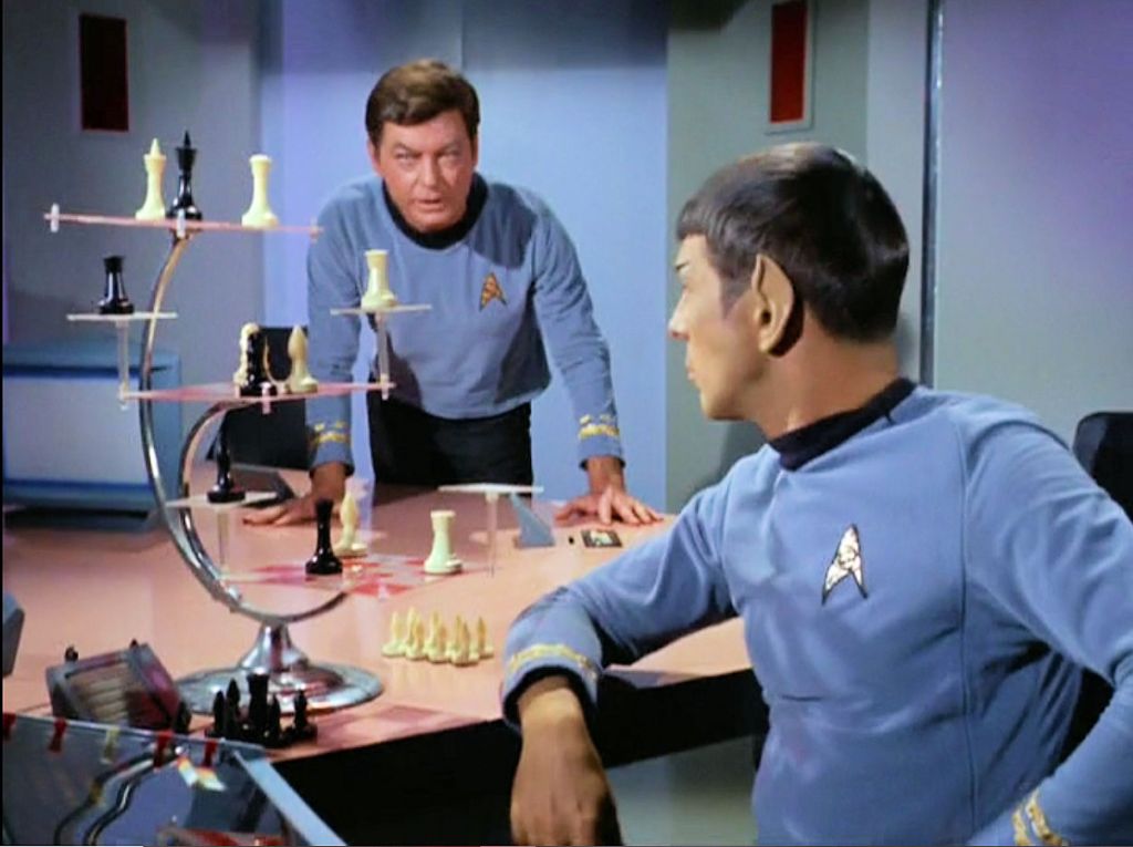 Despite the anti-computer rhetoric in “Court Martial,” the most memorable moments are those between our flesh-and-blood characters. Spock‘s testimony is the most powerful of all because, as with his defense of Kirk in “The Enemy Within,” he is the least likely to base statements on emotional bias. As he has several times in the past, Spock turns to 3D chess for insight, finding that he can consistently defeat the computer in a game for which he himself programmed it. McCoy, on the other hand, is less than stellar, failing his captain by bumbling through a testimony for which he is clearly unprepared. Worse, he becomes downright irrational when he doubts Spock’s intentions with the 3D chess exercise, calling Spock “the most cold-blooded man I’ve ever known.” And Finney is so clearly unstable that, like Bailey (“The Corbomite Maneuver”) and Stiles (“Balance of Terror”), his mere presence on the Enterprise is a mystery. He calls to mind modern-day conspiracy theorists and right-wing fanatics unable to face the impersonal nature of the real world, finding someone to blame for every perceived slight. The Finney we meet in the final act is a homicidal lunatic who has to be subdued by Kirk-Fu and institutionalized; it’s hard to believe he became that way overnight. Meanwhile, Kirk, not for the first time, demonstrates why he is the captain. He is understandably angry, but remains an optimist, trusting that the very system that has turned on him will correct itself and, ultimately, proclaim his innocence. Kirk waives the right to request alternate jurors in the court martial if he feels the current ones are biased, even though Shaw’s marching orders make it clear they are biased. But like the technology that depends on human nature, Kirk’s faith is not really in the system, but in his colleagues’ efforts to keep that system’s standards high.