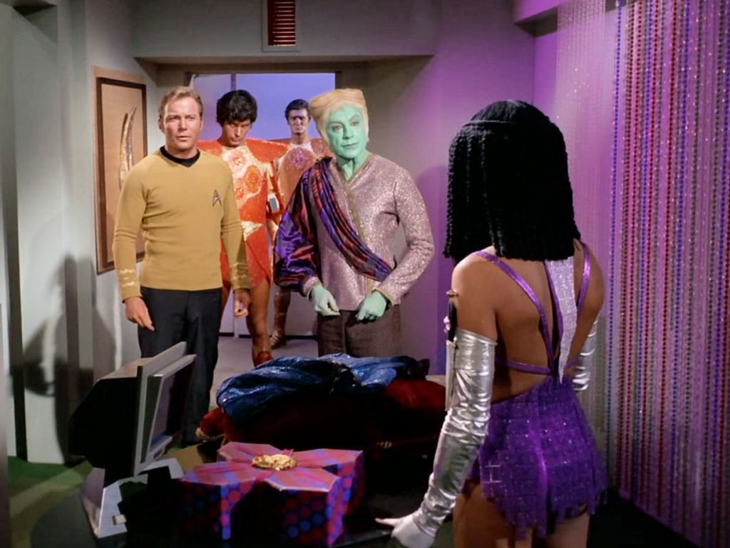 We never learn the Troyian king’s perspective (Elaan refers to him as “a green pig”), but Elaan makes no secret of her opposition to her pending marriage, and not one person thinks about trying to save her from this fate. “I will never forgive the [Elasian] council for putting me through this torture,” she says. Later, even after his infection by Elaan’s tears, Kirk remains committed to delivering the chattel bride: “My orders and yours say that you belong to another man.” In the final scene, Elaan surrenders her dagger in a symbolic gesture: it is a laying down of arms, a sign that peace is at hand; it is also an act of submission, showing that she, like Kate in The Taming of the Shrew, has surrendered her individuality and will resist no further. It’s a ghastly situation treated almost as a joke, just as the “war” between the two planets is glossed over as little more than an inconvenience.