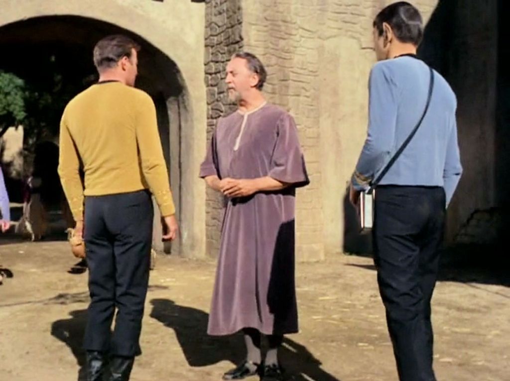 “Errand of Mercy” is Trekdom’s first encounter with the Klingons, and it’s a worthy introduction to these iconic villains. We immediately learn that Klingons shoot first and ask questions later: approaching Organia, the Enterprise is fired on by a Klingon vessel without warning. On the planet, the Klingons are led by Kor (John Colicos, who reprised the role in three episodes of DS9), and if Kor reminds us of Genghis Khan, that’s deliberate: Colicos and makeup artist Fred Phillips developed the look with that in mind. Kor is the ultimate assumptive leader, introducing himself as the “Military Governor of Organia.” Kor gladly lives up to Kirk’s warnings about Klingon nature: “We Klingons have a reputation for ruthlessness. You will find that it is deserved.” Kor prefers his subjects unhappy: “I don’t trust men who smile too much.” He’s also a thorough strategist; while he doesn’t know his enemy’s face, he knows Kirk’s reputation as captain of the Enterprise. Soon, Kor issues edicts limiting the Organians’ freedom and threatens to execute two hundred civilians every hour until they surrender Kirk and Spock.