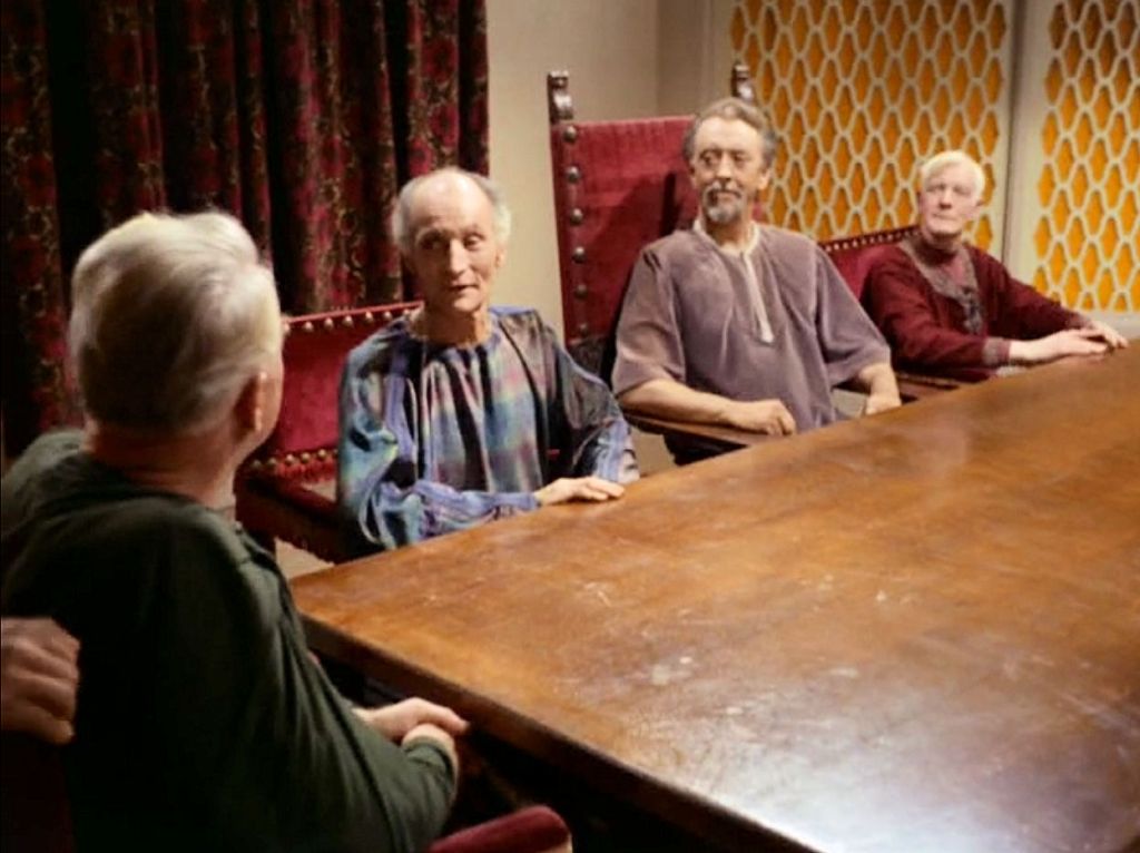 Nearing the end of the first season of TOS, numerous episodes have demonstrated one of the series’ fundamental themes: power corrupts. In “Errand of Mercy,” we find the one exception to that principle in the Organians. This week, in unseen background action, the Federation and the Klingon Empire declare war on each other after failed negotiations over disputed territory. The Enterprise is sent to Organia, strategically located in the aforementioned region, to prevent the Klingons from taking control of the planet. Sort of a tale of two empires. Because the Klingons are known to enslave the inhabitants of planets they’ve conquered, Kirk considers himself to be on an errand of mercy. Arriving just before the Klingons, Kirk pleads with the Organians to side with the Federation. The Organians, represented primarily by Ayelborne (John Abbott) and Trefayne (David Hillary Hughes), remain neutral, insisting the Klingons are no threat to them. The Klingons arrive and declare what amounts to martial law, turning the Organians’ council chambers into an awfully bleak house.