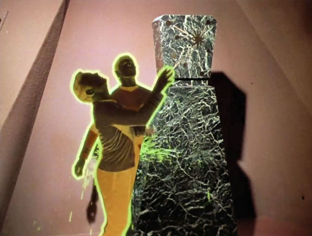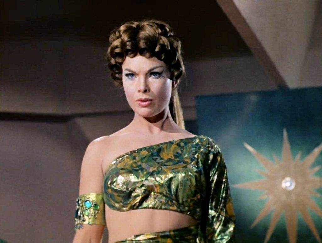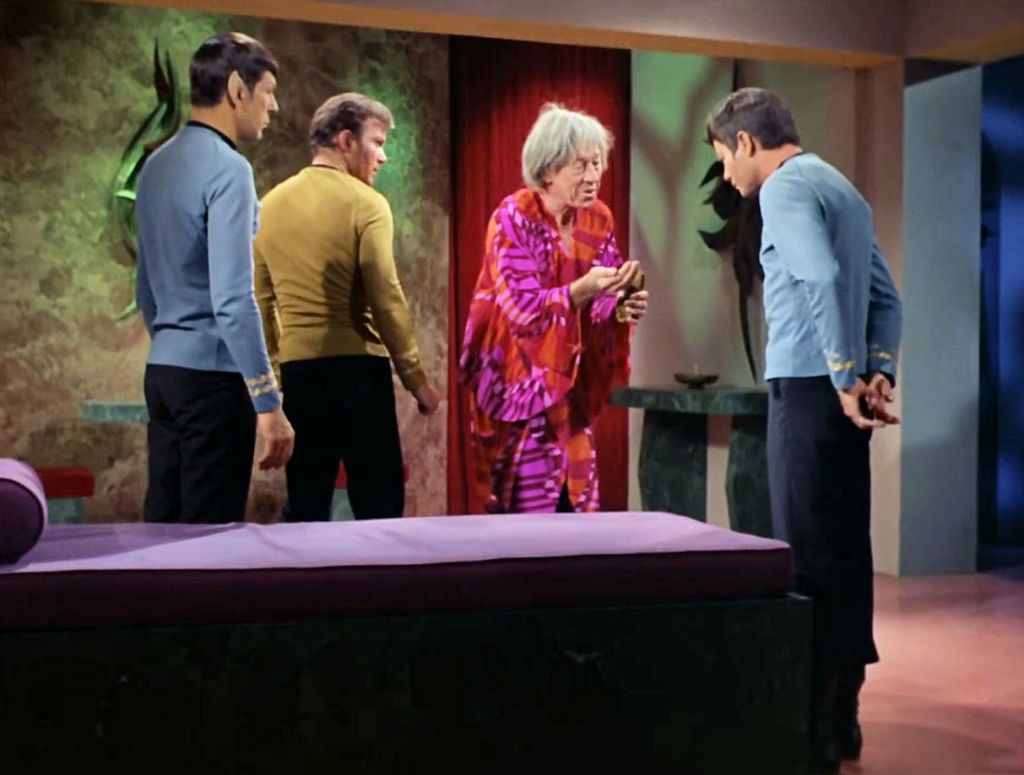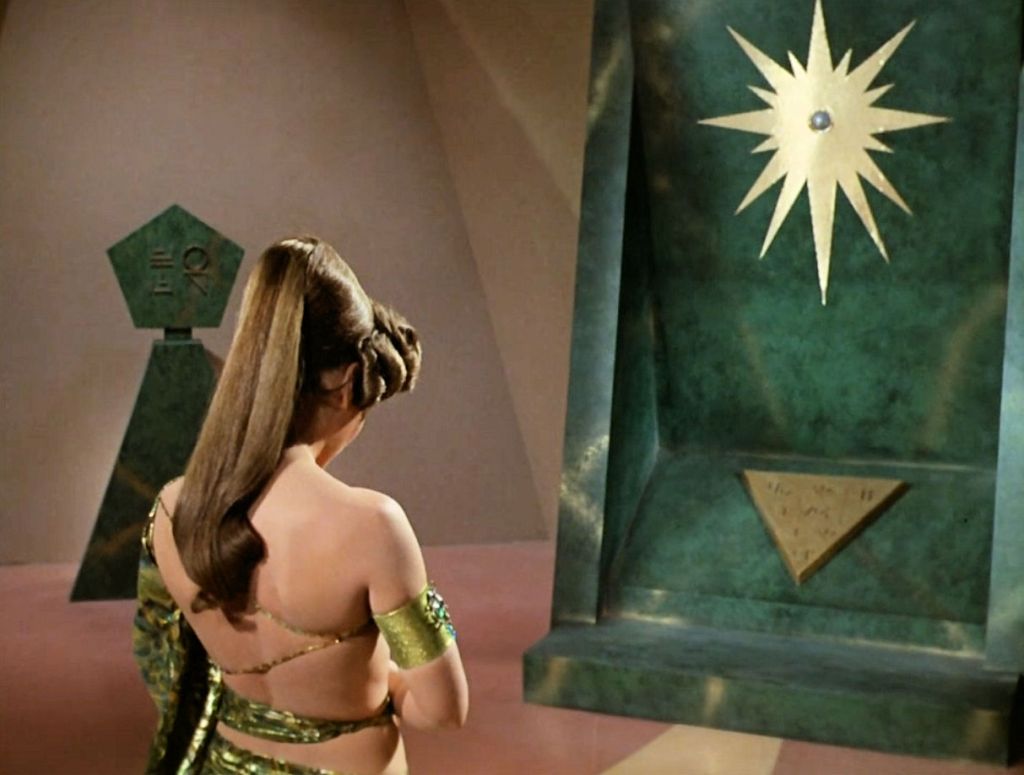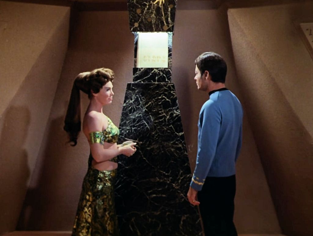 From my previous viewings of “World,” I had forgotten Natira’s intriguing character arc. As Yonada’s High Priestess, she comes across as a confident leader initially, ordering various underlings as they first assault, then play host to, Kirk, Spock, and McCoy. She is downright bold in approaching McCoy, speaking with complete candor about the immediate attraction they feel for each other. She claims it is customary in Yonada for people to speak openly about their feelings, but we don’t sense the same confidence from the few others we meet. Yet Natira kneels before the Oracle and follows its instructions without question, making her as subservient as all the other Yonadans. Once Kirk and Spock defeat the Oracle and convince Natira of the truth, and McCoy removes the obedience instrument when the Oracle assaults Natira for her blasphemous thinking, the High Priestess becomes a true leader. Both wiser and more humble, she sends new husband McCoy (more on that shortly) on his way, determined, like Moses, to lead her people to their promised land.