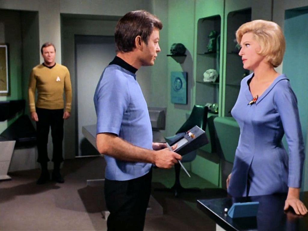 In their short time together, McCoy and Natira do a fine job of negotiating what amounts to an interfaith marriage. We can reasonably infer that McCoy is atheist or agnostic. Natira is definitely the subject of a religious order – she refers to her Fabrini ancestors as “creators,” words like “sacrilege” and “repent” are thrown around, and she kneels on an altar to speak with the Oracle. While McCoy doesn’t commit fully to Natira’s belief system – that would be dishonest – he does accept her rituals entirely, including the implant of an obedience instrument. This commitment earns McCoy influence later, when the Oracle wants to execute Kirk and Spock for snooping around; McCoy pleads their case with Natira and she concedes. Ultimately, this influence is what saves the day, when Natira values her oath to McCoy over her duties to the Oracle, accepting that Yonada is a spaceship: “I believe with you, husband.”