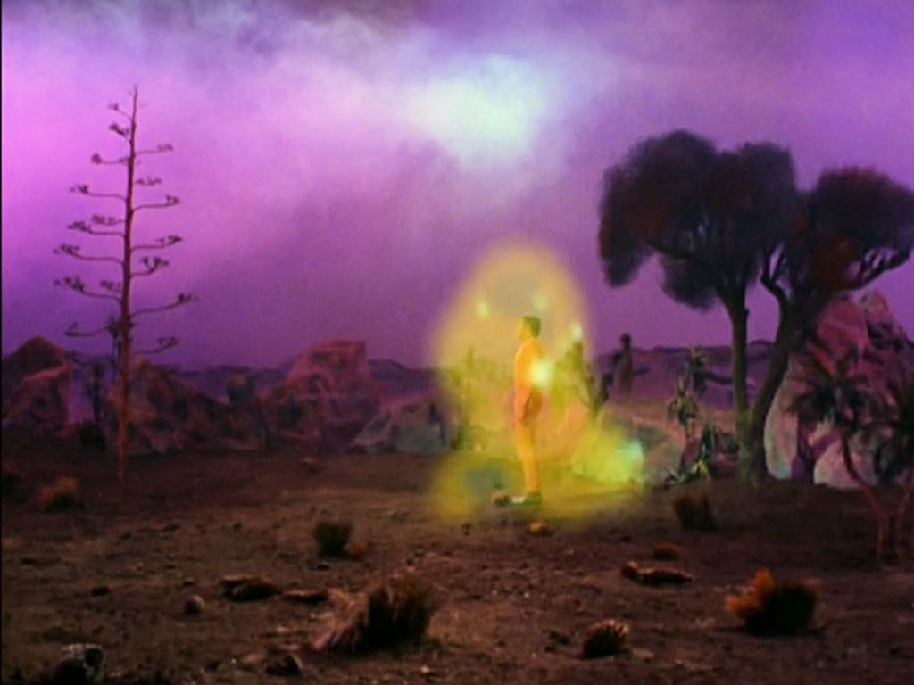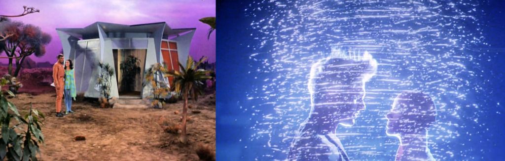 The American Heritage Dictionary defines metamorphosis as “a transformation, as by magic or sorcery,” and “a marked change in appearance, character, condition, or function.” Several symbolic transformations take place in the episode, including Kirk’s change of strategy toward their captor, Cochrane’s reversal in attitude toward the Companion, and the primary metamorphosis that inspires the episode’s title: the merger of the Companion with Commissioner Hedford. This transformation is defined by TOS’ inevitable tendency toward human exceptionalism. The Companion, in human form, marvels at the feel of earth (get it?) against her feet and sun on her face, finding tangible form superior to her previous diffuse existence. Hedford, on the other hand, has no comment on how it feels to have the superpowers of an eternal electric field. Despite Spock’s reminder that humans are “irrational,” we’re to assume that the Companion was somehow inferior until humans came along and gave it a body: “To touch the hand of man,” she says, “nothing is as important.” I couldn’t help but contrast this with the merger of Decker, Ilia, and V’Ger in Star Trek: The Motion Picture (1979), with Kirk, Spock, and McCoy this time speculating that the resulting new life form may represent humanity’s future evolution.