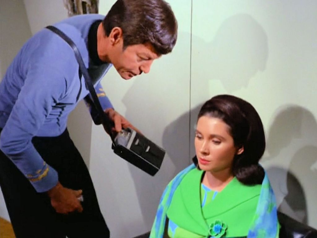 We take a bit of a nostalgia trip this week in “Metamorphosis.” The prologue returns us to the shuttlecraft Galileo – except with a more spacious interior than it had in “The Galileo Seven” – with Kirk, Spock, and McCoy escorting Assistant Federation Commissioner Hedford (Elinor Donahue) to the Enterprise for emergency medical care. Hedford contracted a life-threatening illness during negotiations to prevent a war from breaking out. (Why is the Enterprise so far from the away team? Who knows?) En route, the shuttle is hijacked by an unknown force and crash-lands on an unnamed planetoid. The crew encounters Zefram Cochrane (Glenn Corbett), “discoverer of the space warp,” and the hijacker itself, a disembodied electric field Cochrane refers to as the Companion (voiced by Elizabeth Rogers, who also played communications officer Lieutenant Palmer in “The Doomsday Machine”). Cochrane tells the away team he had gone to space to die as an old man; the Companion found him, de-aged him in less time than it takes to watch The Irishman, and has kept him healthy and ageless for 150 years. The Companion has grown attached to Cochrane, “almost a symbiosis,” as McCoy describes it; rather than release Cochrane, hungry for company from his own kind, the Companion intends the away team to remain indefinitely to be his friends.
