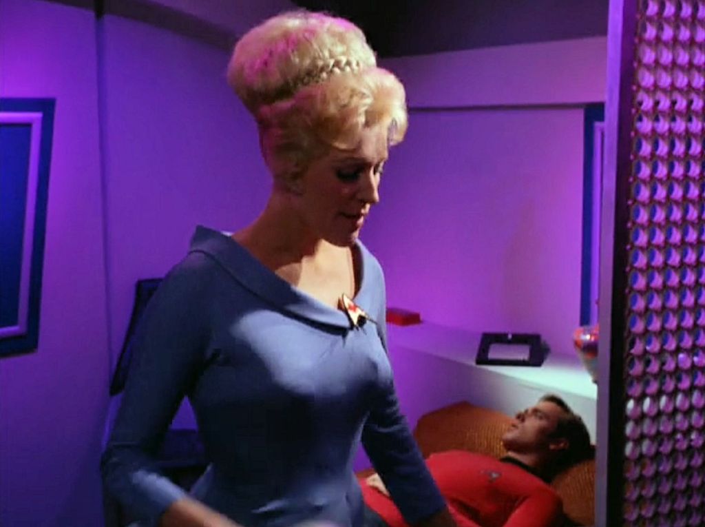 Nurse Chapel is another featured character in “Obsession,” one we’re always glad to see. She has a lovely exchange with Garrovick, when she brings a meal to his quarters with encouragement to eat and keep his strength up. “Self-pity’s a terrible first course,” she tells him. It’s an added bonus that Chapel has taken this initiative on herself, without orders from McCoy. Chapel even concocts a phony prescription, allegedly from McCoy, requiring Garrovick to eat under threat of intravenous nutrition. As far as we can tell, Chapel is the second most senior medical officer on the Enterprise, so it makes sense that she would have considerable discretion in maintaining the crew’s health.