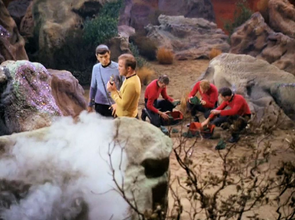The cloud, as a character, is unspectacular, endowed with whatever traits it needs for the story. A “sickly sweet smell” becomes noticeable anytime the cloud is about to appear. It drains its victims of red blood cells, presumably to feed off the iron in their hemoglobin, as Spock’s copper-based blood provides resistance. We assume this is the same cloud that attacked the Farragut without considering that maybe this is another member of the same species. It is composed of, among other things, the element dikironium, which Spock says was not previously believed to exist in nature. Except the cloud can magically change its chemical composition at will to avoid detection. If we accept that this is the only surviving cloud, that makes it another one-of-a-kind similar to the salt vampire from “The Man Trap” and the Companion from “Metamorphosis.” Unlike those earlier “villains,” the cloud is nothing more than a plot device to create conflict for our characters. One of the Tor rewatchers speculated that the cloud could be analogous to Agent Orange or some other poison gas. Agent Orange was specifically developed as an herbicidal weapon and first used by the British in Malaya in a starvation campaign again insurgents who opposed British mismanagement of the Malayan economy. Agent Orange was later used heavily in Vietnam by the U.S. and as early as 1966 U.N. resolutions accused the U.S. of violating the Geneva Convention’s prohibition of chemical and biological weapons. Correlating the cloud with Agent Orange is a fascinating idea that would have made for a far more interesting episode – maybe the cloud is another wayward weapon, like the planet destroyer in “The Doomsday Machine.”