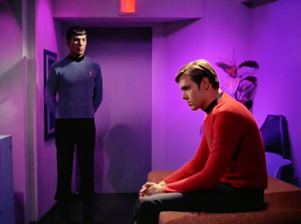 Garrovik, on the other hand, doesn’t experience guilt at first. While he’s distraught over the deaths of his shipmates, he initially doesn’t consider his hesitation – a fraction of a second – to have been significant. Kirk berates Garrovick in front of other officers, however, causing Garrovick considerable angst over letting down both his peers and his captain. Garrovick is an interesting character: the son of a former starship captain and a 3D chess player (we see the set in his quarters). It’s a shame he doesn’t get to do much in the episode other than look anguished and engage in a brief, and ridiculous, fistfight with Kirk when the two men try to out-martyr each other in the episode’s climax.