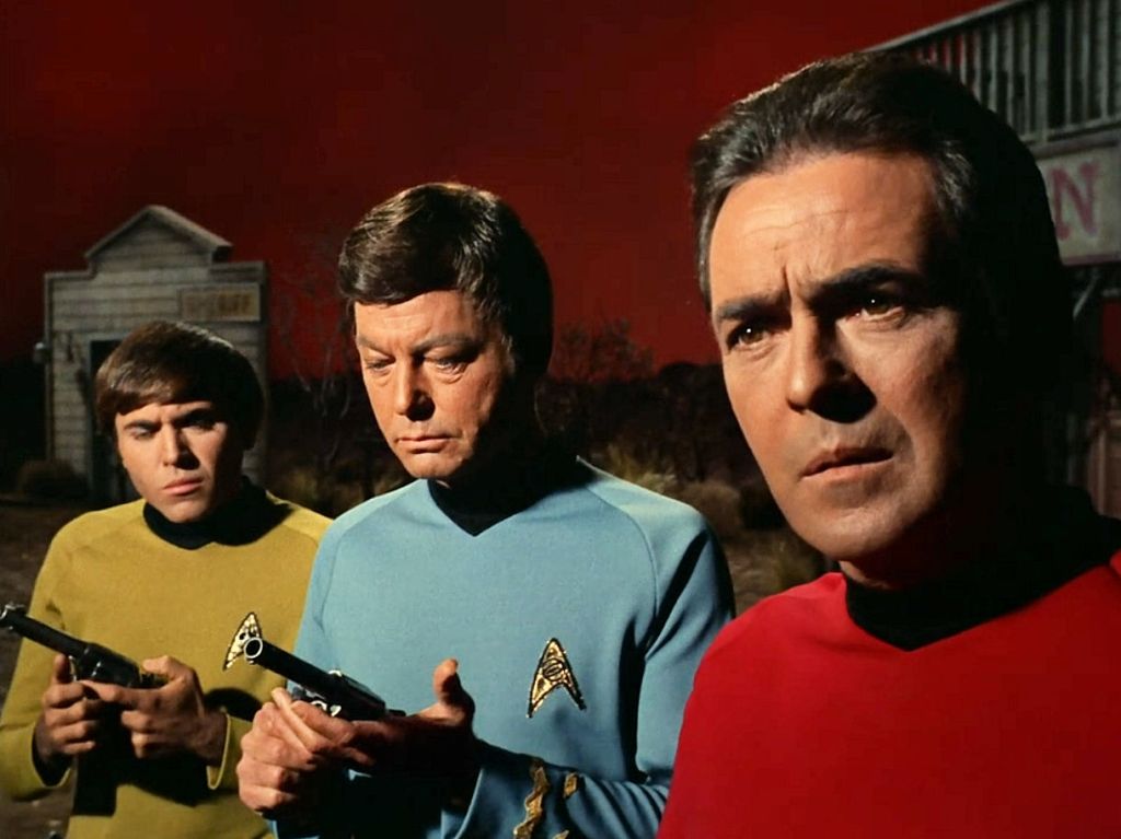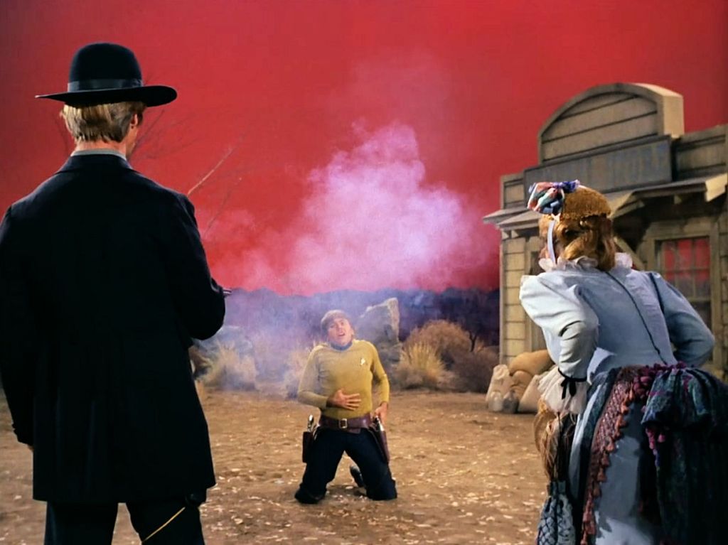 When to use violence, proactively or in self-defense, is a main theme of the episode. The Melkotians could argue they’re acting in self-defense when they threaten to execute the landing party: they did offer a clear warning, after all, making the Enterprise crew the aggressors. However, such determination is inconsistent with the Melkotians’ abrupt change of heart at the end. When the gunfight finally occurs – with a dramatic shot of the Earps’ bullets passing through the landing party and shattering the fence behind them – the conflict seems resolved. Yet Kirk charges forward and starts a fistfight with Wyatt Earp (Ron Soble). It seems a bizarre choice considering Kirk has begged for non-violence throughout the episode. Kirk handily knocks Wyatt to the ground and pulls a gun on him. Just as with the Gorn in “Arena,” Kirk comes to his senses and spares his opponent’s life. Though Wyatt is presumably as imaginary as the bullets, the gesture persuades the Melkotians to give up their whole “Go away” stance and welcome the crew to a visit.