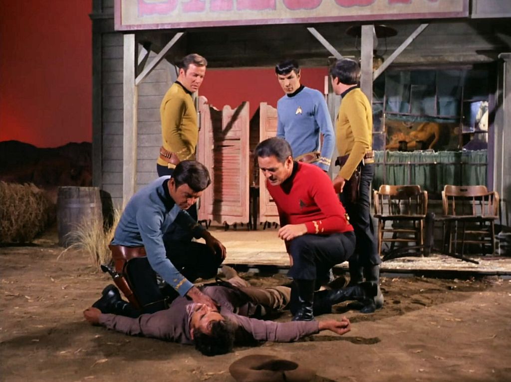 The most important message in “Spectre of the Gun” is the importance of custom and location in determining our perceived reality. The landing party is never entirely certain they’re on Melkot, given the foggy, featureless surface, inconsistent with sensor readings, where tricorders and communicators don’t function. They’re equally unsure of what’s true or not in the fantasy version of Tombstone. The buildings are only facades from outside but become substantial enough when entered. “That’s one thing we can be sure of here,” Kirk says when an apparently dead cowpoke is tossed out of the saloon. “Death is real.” Yet their ability to survive the gunfight, not to mention Chekov’s miraculous recovery, proves otherwise. Spock says, “History cannot be changed,” but the landing party is only experiencing a facsimile of history. Only the failure of the tranquilizer – a chemical mixture that should have been fool-proof – confirms the unreality they now inhabit. “Physical reality is consistent with universal laws,” Spock says. “Where the laws do not operate, there is no reality.”
