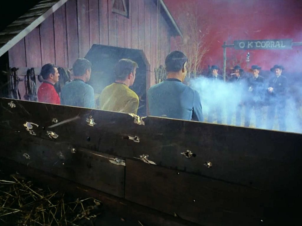 “Spectre of the Gun” is then an unintentional endorsement of the scientific method, evaluating the validity of a hypothesis via reproducible experimentation. McCoy and Spock demonstrate this when they initially fail to test the makeshift tranquilizer. McCoy claims, “It’s not necessary, Captain. It’s very simple. Nothing can go wrong.” But Kirk has recent evidence proving otherwise: “Up to now, everything has gone wrong.” And he’s right, because confirming the tranquilizer’s ineffectiveness is what saves them. Kirk also draws from centuries of history – experimentation and outcome on an epic scale – when he tells the Melkotian, “We fight only when there’s no choice. We prefer the ways of peaceful contact.” He knows nonviolence is far more likely to result in a productive outcome. It would be easy to interpret the crew’s resistance to bullets in Tombstone as metaphysical mumbo-jumbo, an implication that we can choose our own reality, but in fact the opposite is true. As Spock told us earlier, we can’t function effectively until we understand the lay of the land. Conspiracy theorists have made fiction reality and turned the world upside down, the inevitable outcome of the “I’m entitled to my opinion” fallacy, escalating threats of violence and turning every day into a potential shootout. Only by reclaiming the truth and setting the historic record right can we rise above the specter of violence and live peacefully in the real world.