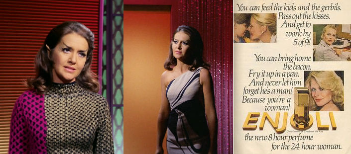 Many criticize “The Enterprise Incident” because they feel the Commander is too stereotypically feminine, too easily manipulated by Spock. Is she, though? Right through the final scene, we’re not certain how much of the Spock/Commander chemistry is sincere or manufactured as a means to an end. Why else would she have herself beamed on board the Enterprise? She’s too wise to believe a lasting relationship with the First Officer is feasible. We leave the episode assuming Kirk, Spock, and company have outsmarted the emotional woman, but maybe the Commander is simply playing a longer game. Maybe the real discrimination is with us, the viewers: We give the men permission to manipulate women emotionally, but can’t accept the female leader manipulating men in the same fashion? And if Kirk can rip off his shirt now and then, there should be nothing wrong with the Commander slipping into a slinky gown. Even if the Commander really does feel an emotional bond with Spock, the burden of hypocrisy is still with us. It’s Kirk’s prerogative to cope with the stress of command by engaging in one affair after another. Why should the woman be denied the same?